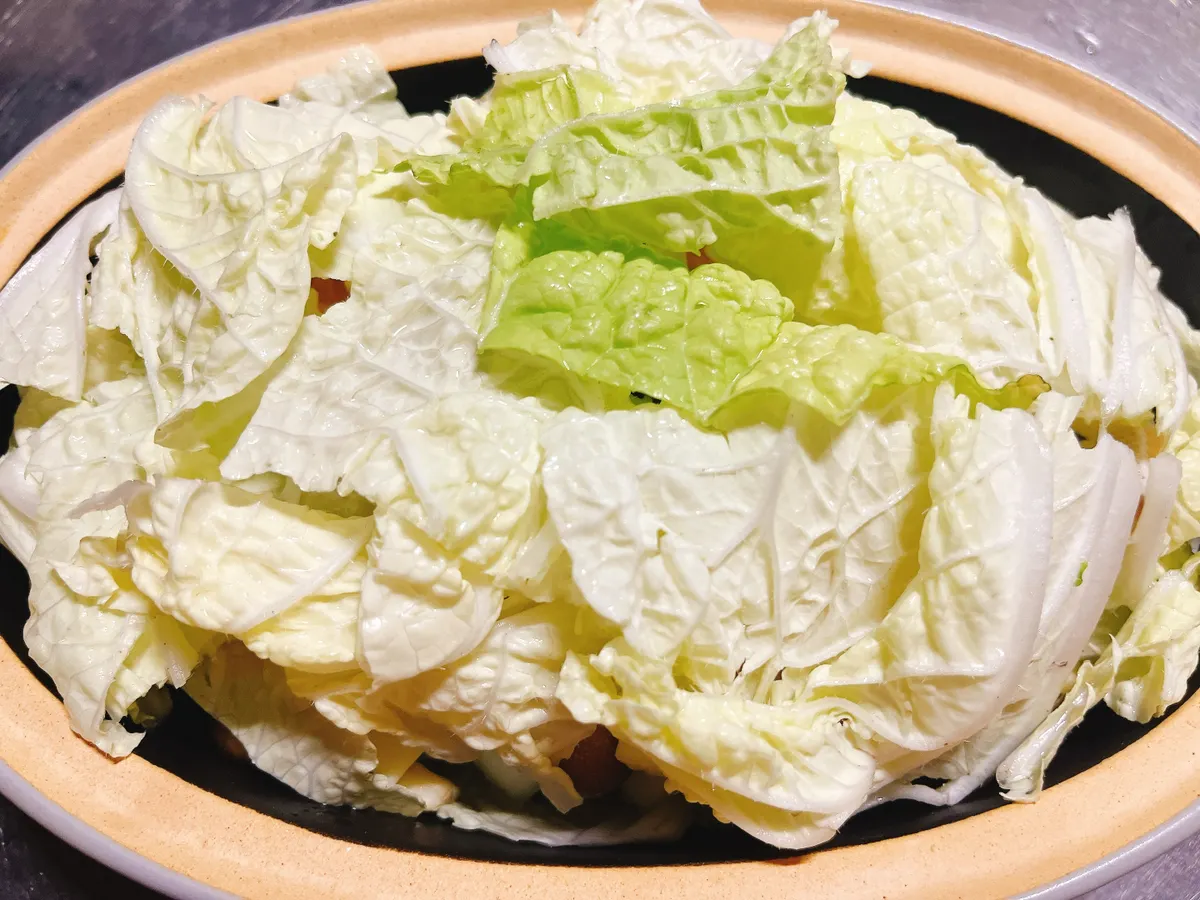 料理酒を回しかけたら、白菜の葉の部分で覆います。