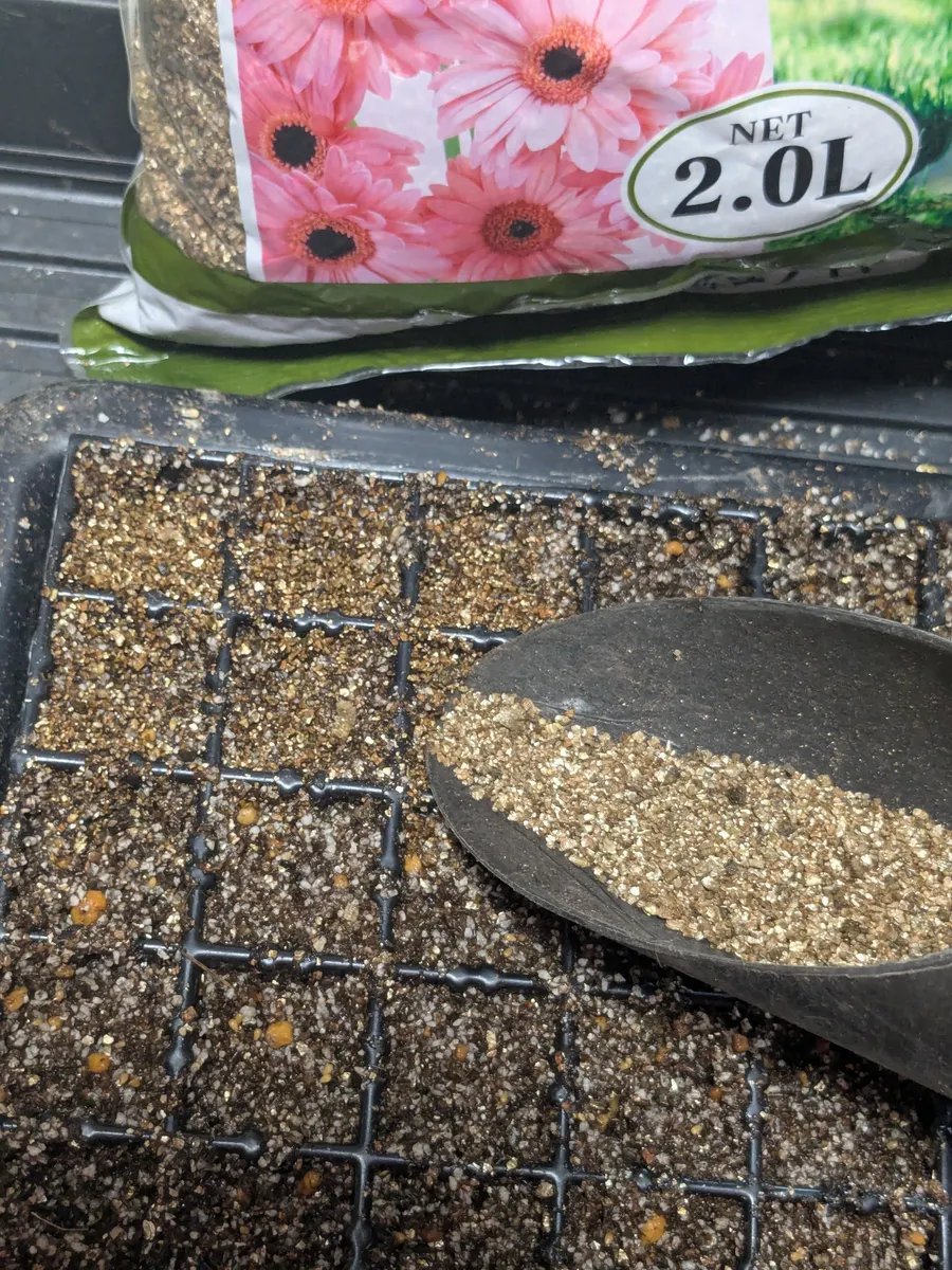 薬の小分け容器に発芽に適した水温の水を張って種を蒔きます。
