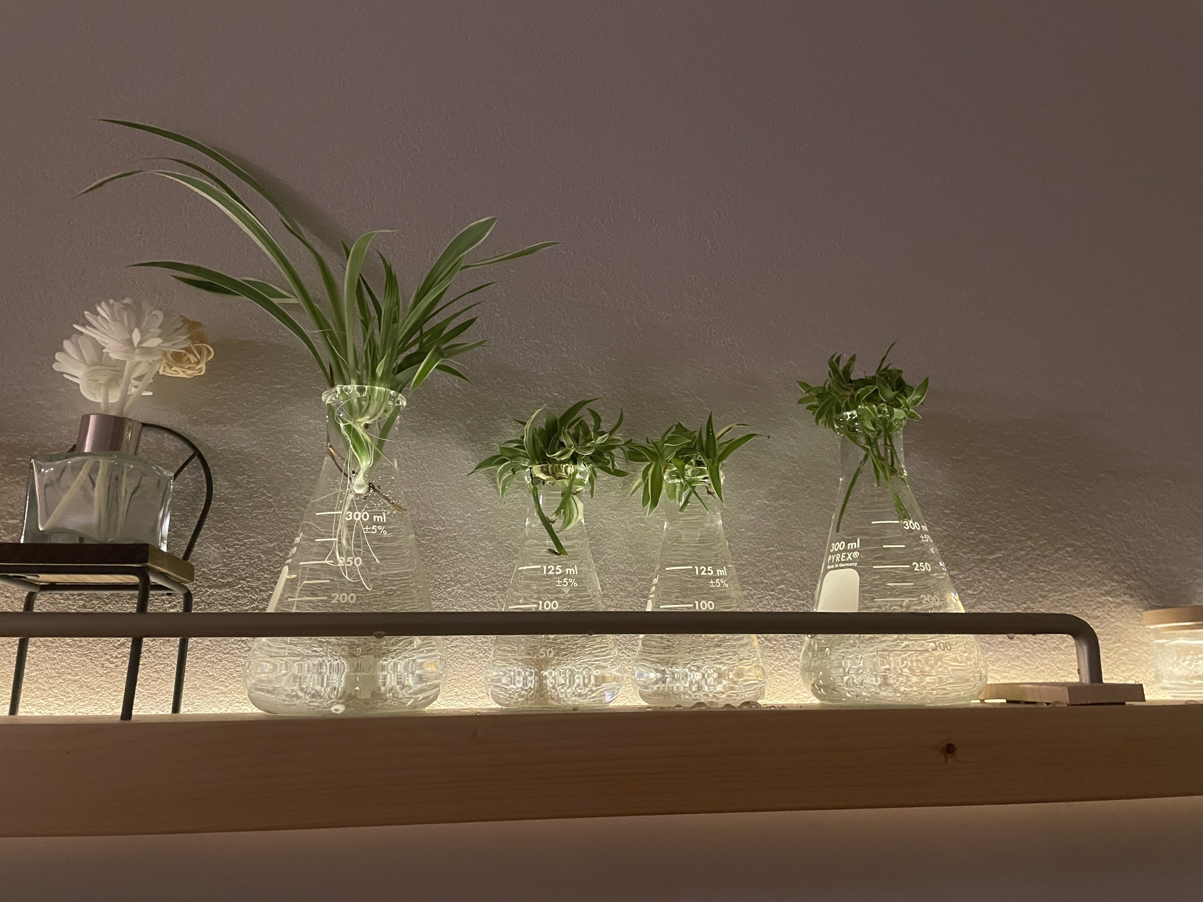 投稿を表示鉢植えのオリヅルランも良いですが、こうしてフラスコに小分けして並べて、全くちがうインテリアになってますね。