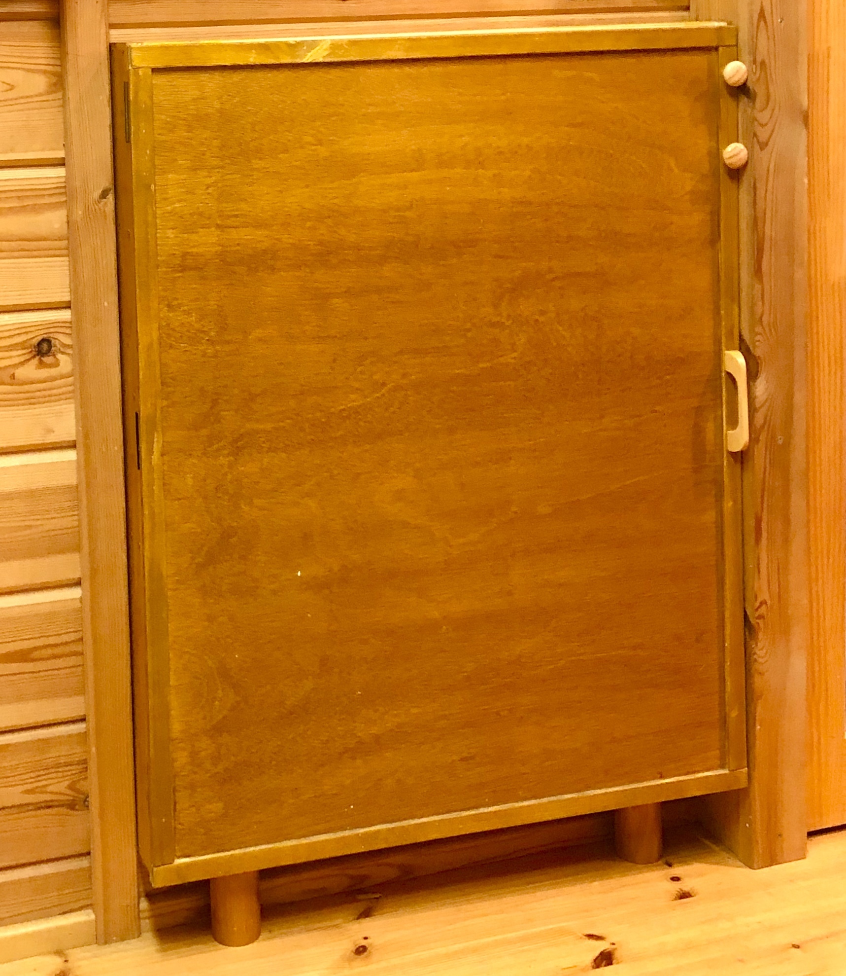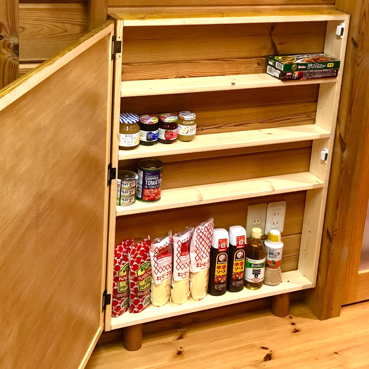 ベニア板の厚みと扉のサイズの関係で、扉を開閉すると対角線にたわんでしまうのが気になるところ💦