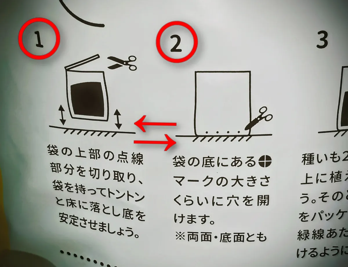 2番目に穴を開けるように書かれているのですが(底面14箇所)、これは逆です。最初に袋を開ける前にやることです。「ちょっと待てぃ🖐️❗️袋開封してから底穴開けるっておかしくない⁉️袋を逆さまにしないときちんと底穴開けられないじゃない‼️土こぼしながら穴開けろってこと⁉️🤨」と、昨年植える前に気付いた私はセーフ…😑今年は訂正してあるだろうと思ったのですが…印刷そのままやん!!😭