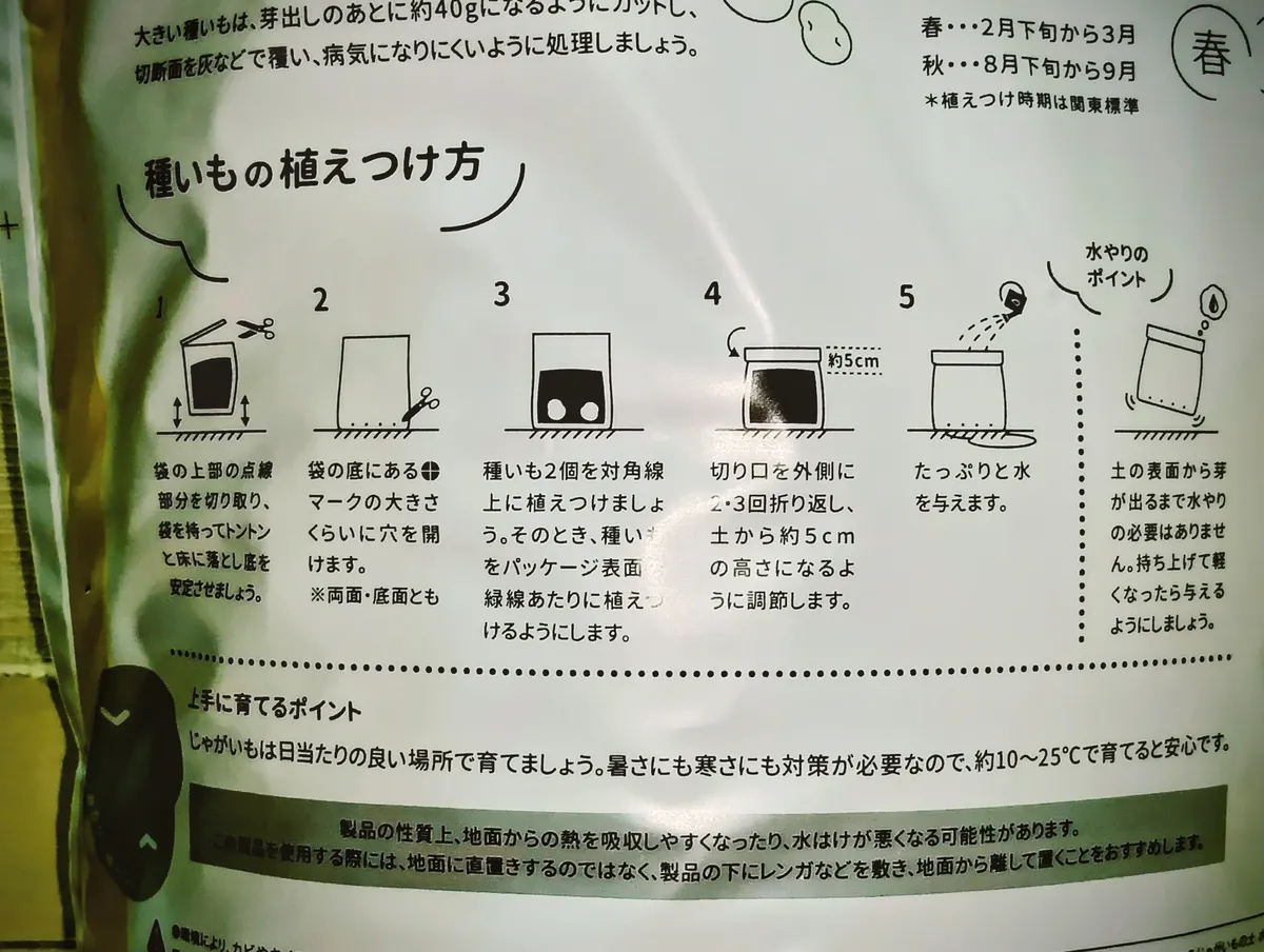 植え付け前に穴開け作業があります。袋をプランターとして使うからには、水捌けを良くしなくてはなりません。これ、とても大事なんです。じゃがいもは水捌けが悪いと腐りやすい。「ポテトバッグ」を購入した方は袋の裏面に印刷してある取説通りにすると思いますが、コレ間違ってるぞ!と思うところがありまして…🥺