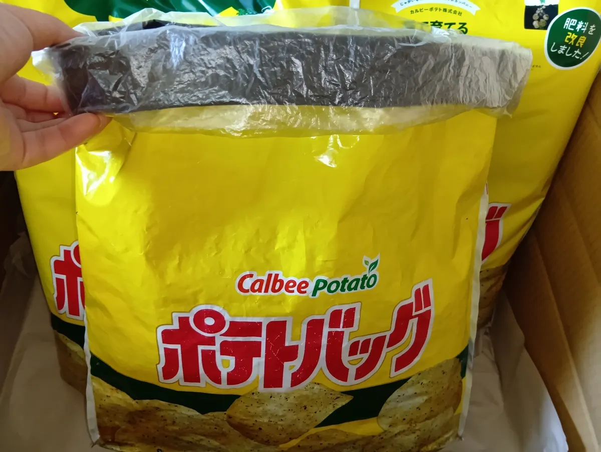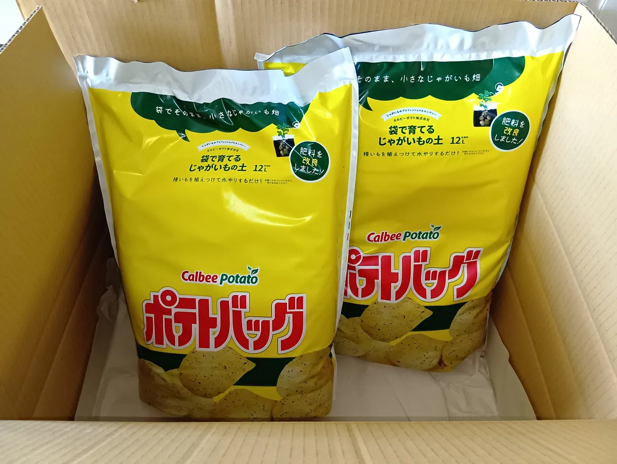 次は培養土を用意します。じゃがいも2種類なので「ポテトバッグ」を2袋ネットで購入しました。同じ培養土で挑戦です😁✌️