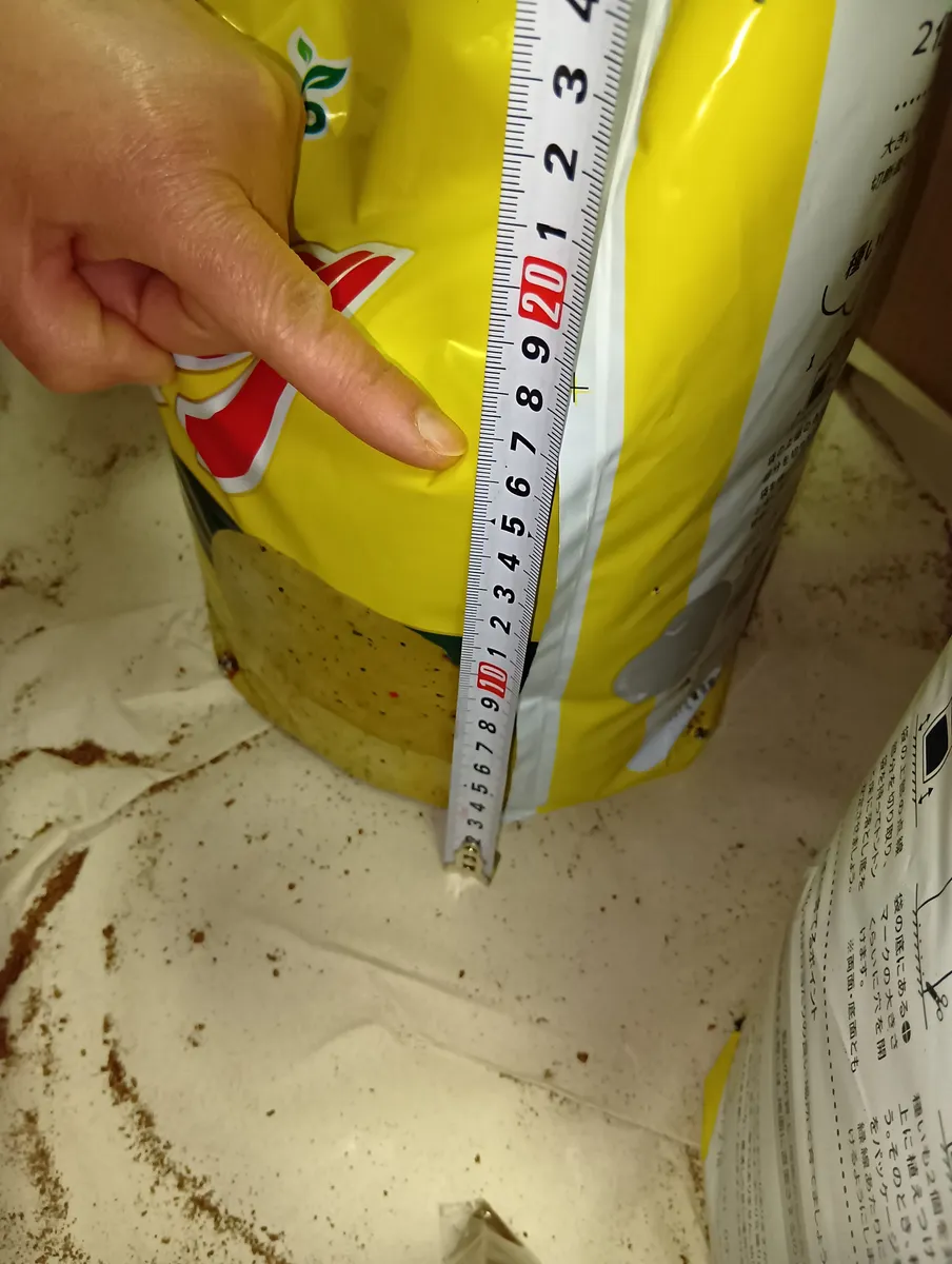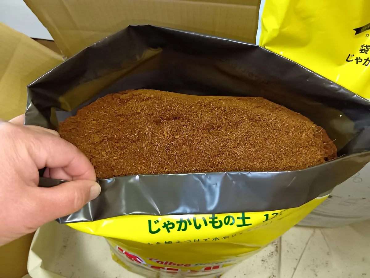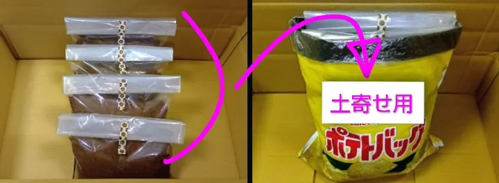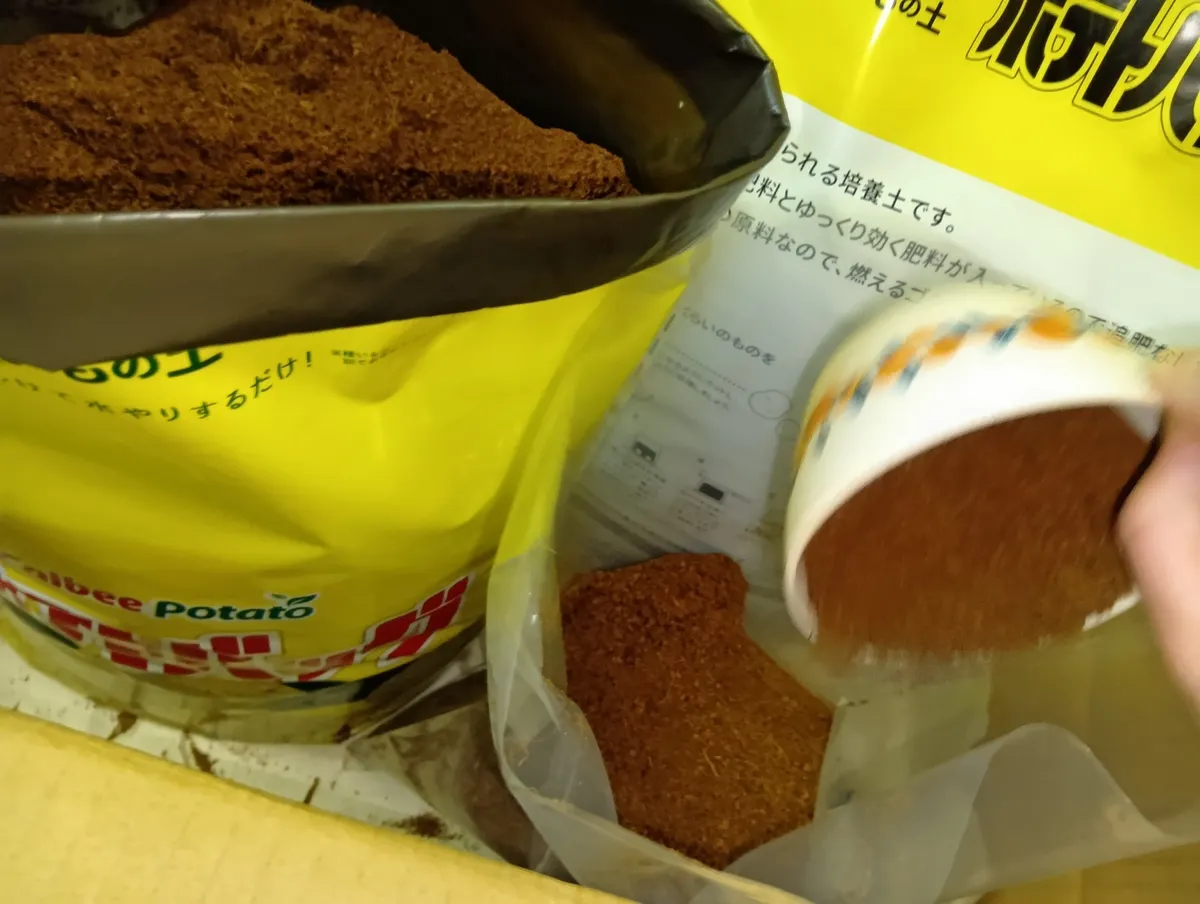 ②種芋を埋めるための土を2L取り出します。これはすぐに使うので、袋を閉じなくて良いです。