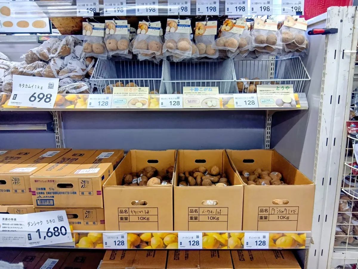 🥔キタアカリ︰ホクホク系で、煮崩れしやすいのでポテトサラダ、フライドポテト、じゃがバターなどに向く。見た目はゴツゴツしている。断面は黄金色で別名栗ジャガとも呼ばれ、甘みが強い。そうか病、青枯病には弱い。