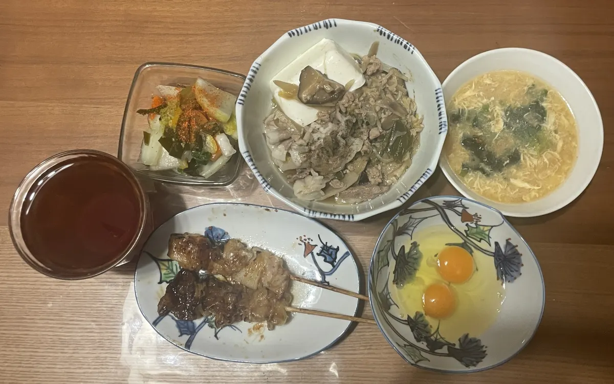 柚子白菜漬け・牛肉ですき焼き作った後の肉無し繋ぎものに豚バラバージョンですき焼きリメイクしたやーつ・繋ぎものほうれん草と卵のお味噌汁・半額焼き鳥✨