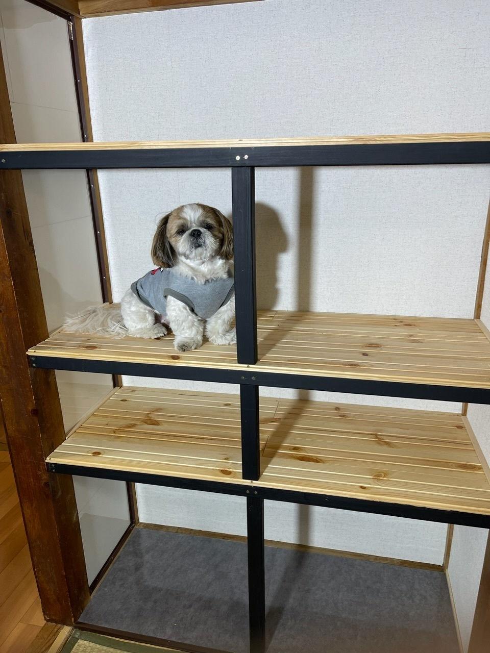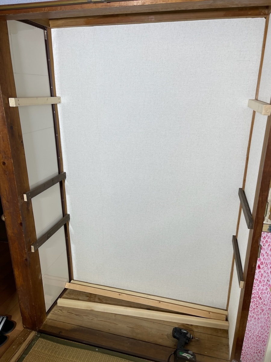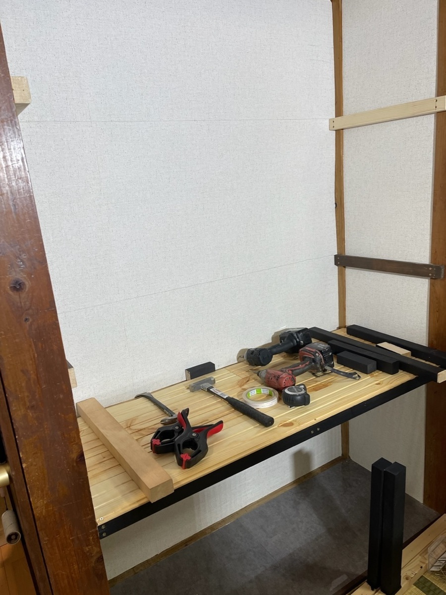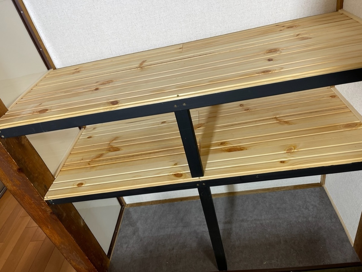 (全板に立ってるから、例えば1段目の棚板の下に1本立てちゃうと、2段目の下に来る角材の下の部分がビス打てない筈なのにどうやったのっ😵⁉️💦)
