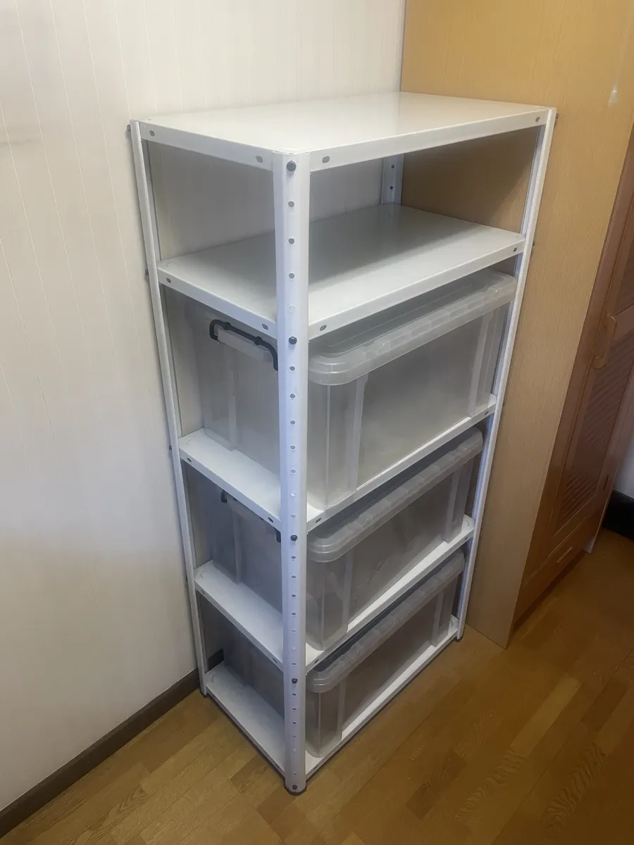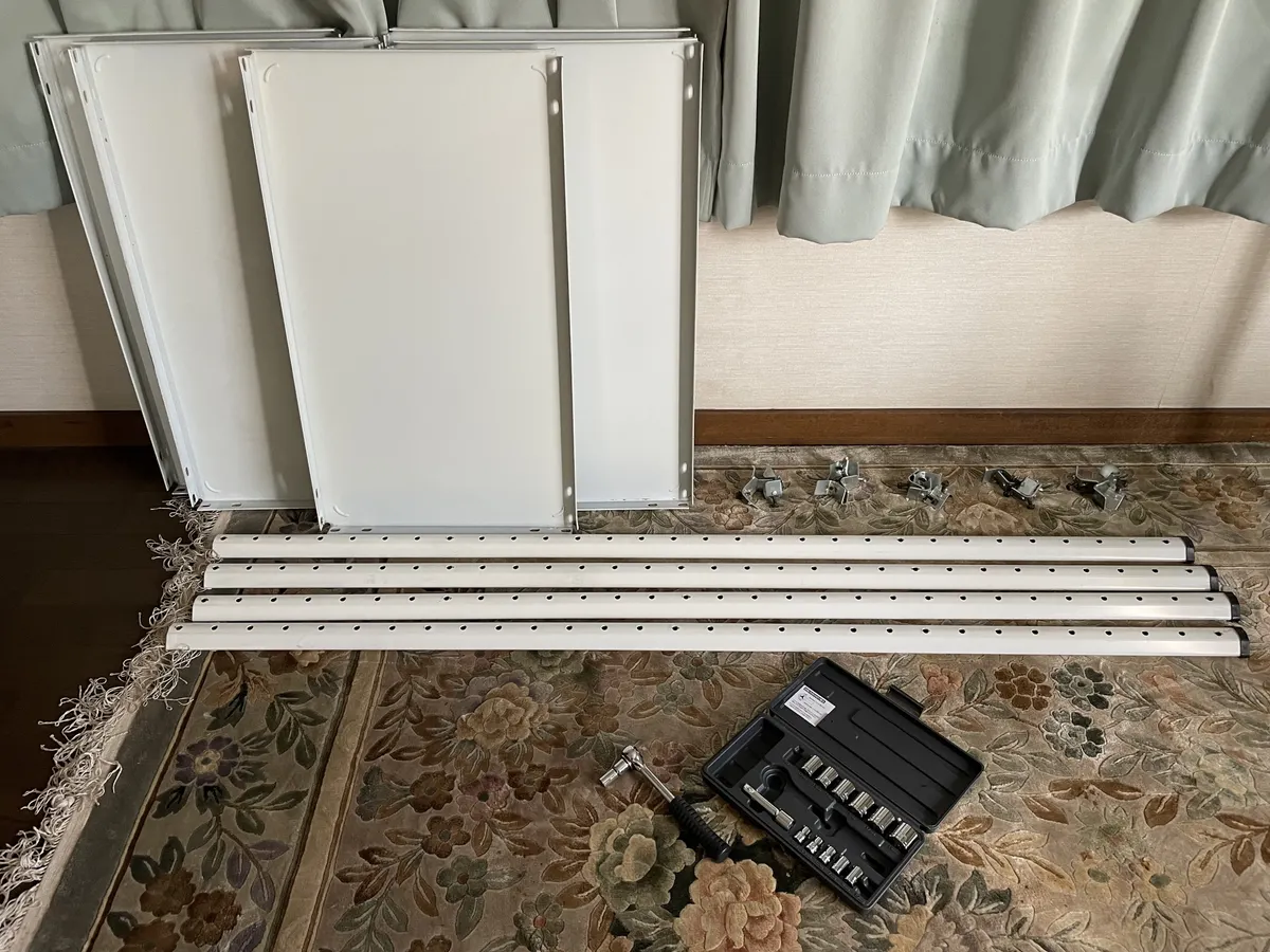 この手のスチール棚は、組立てに手こずります。解体の倍くらいの時間が掛かってしまいました。