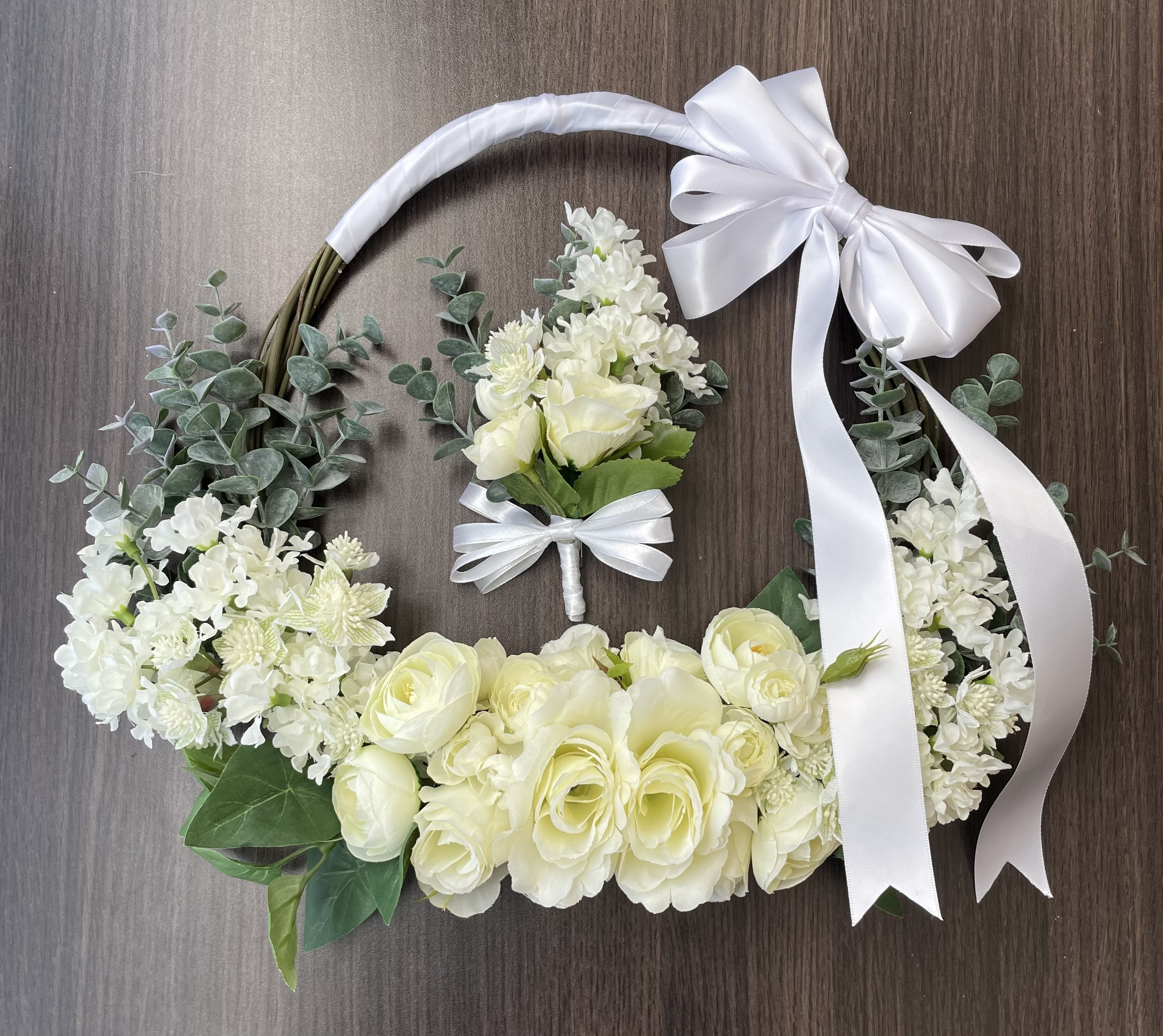 どうやって作るか悩んだ末、我が家の庭にある白いモッコウバラの若いつるでリースを作り数週間乾燥させてカインズさんと雑貨屋さんの造花とフェイクグリーンでリースとブートニアを完成させる事が出来ました💐息子も娘も喜んでくれて幸せでした…私が😁