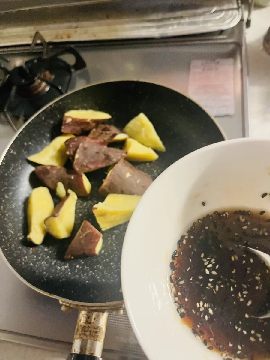 煮詰めたトローリとした蜜じゃなくサラッとしてるけど、フライパンの蓋したまんまほったらかしで美味しく出来ました。