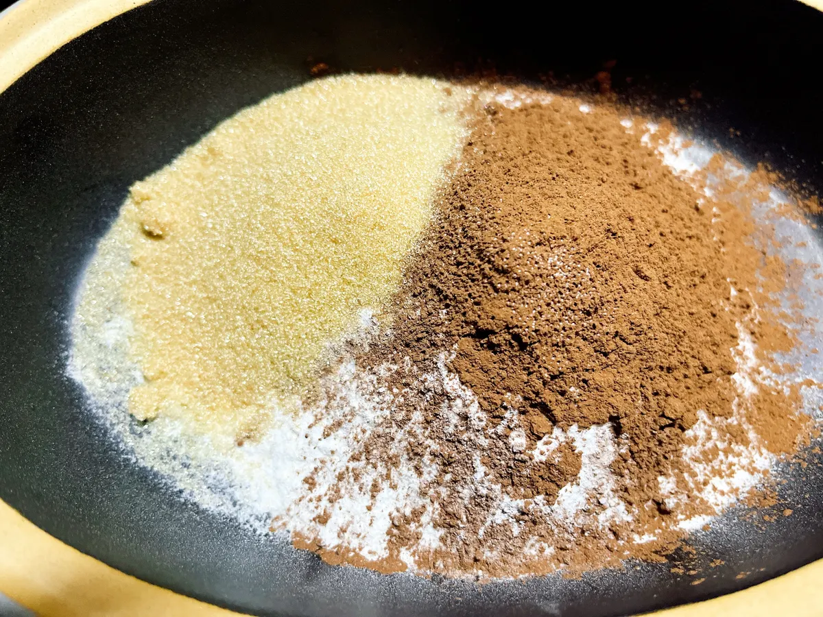 パスタポットに、米粉・ラカント・塩・カカオの力(ココア)入れて、ゴムベラで軽く混ぜ合わせます。