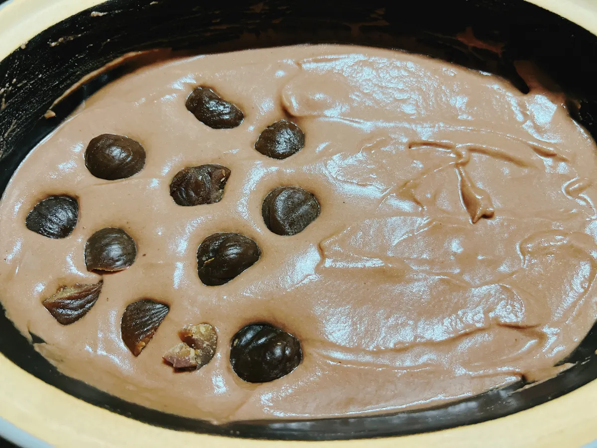 表面をならして、お好みで半分だけマロングラッセを入れます。