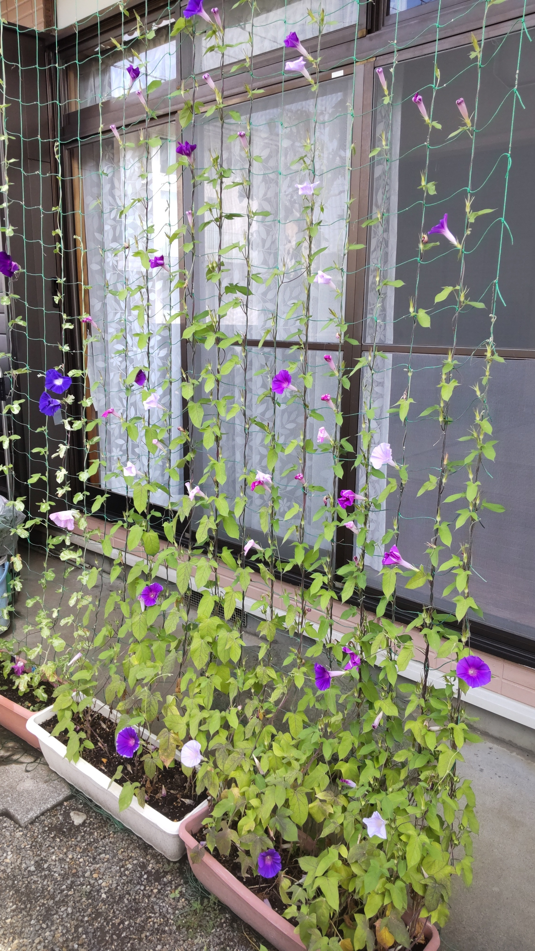 私 昨年朝顔のグリーンカーテン:カーポート横で挑戦したのですがKobayanさんと品種が違ったからかプランター下にまで根付いて旺盛に広がり、隣のお宅にまで伸びて行って大変な事態になりました。まだまだ成長すると思うのでkobayanさんのプランター下も地面(土)の様ですから要注意です😅