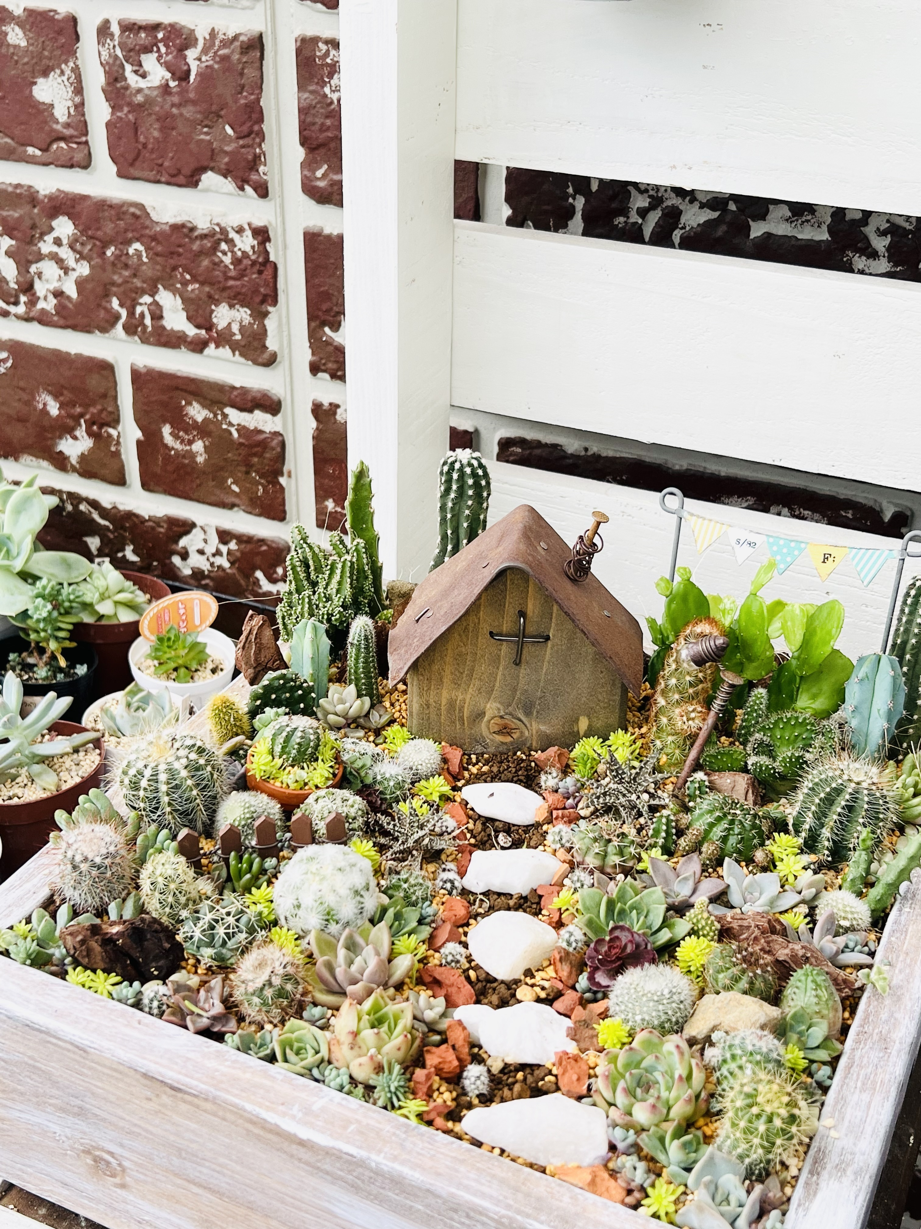 木箱を作って、その中にミニサボテンの箱庭を作りました😊