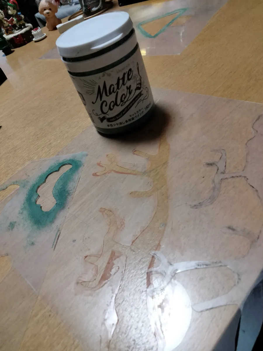 切り抜いた透明ファイル材料費10円❗端材280円塗料は家にある物使用して290円にてお正月プレート完成✌️寒く成るお正月時期もほっこり気分に懐暖かいです❣️