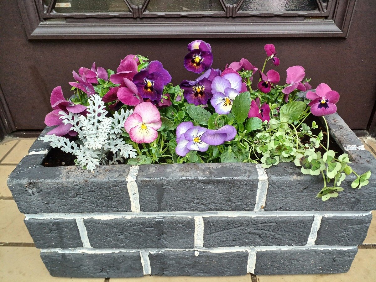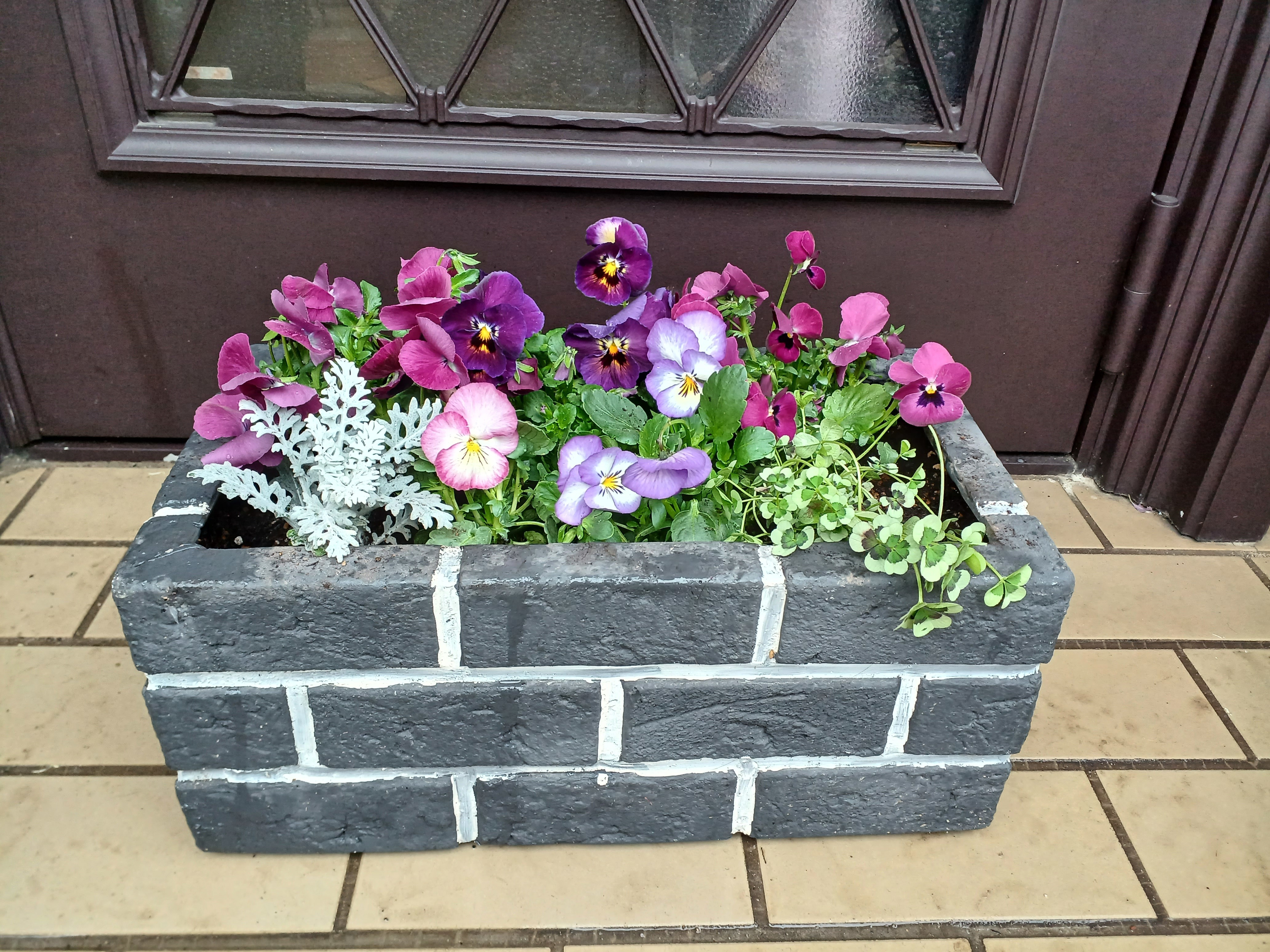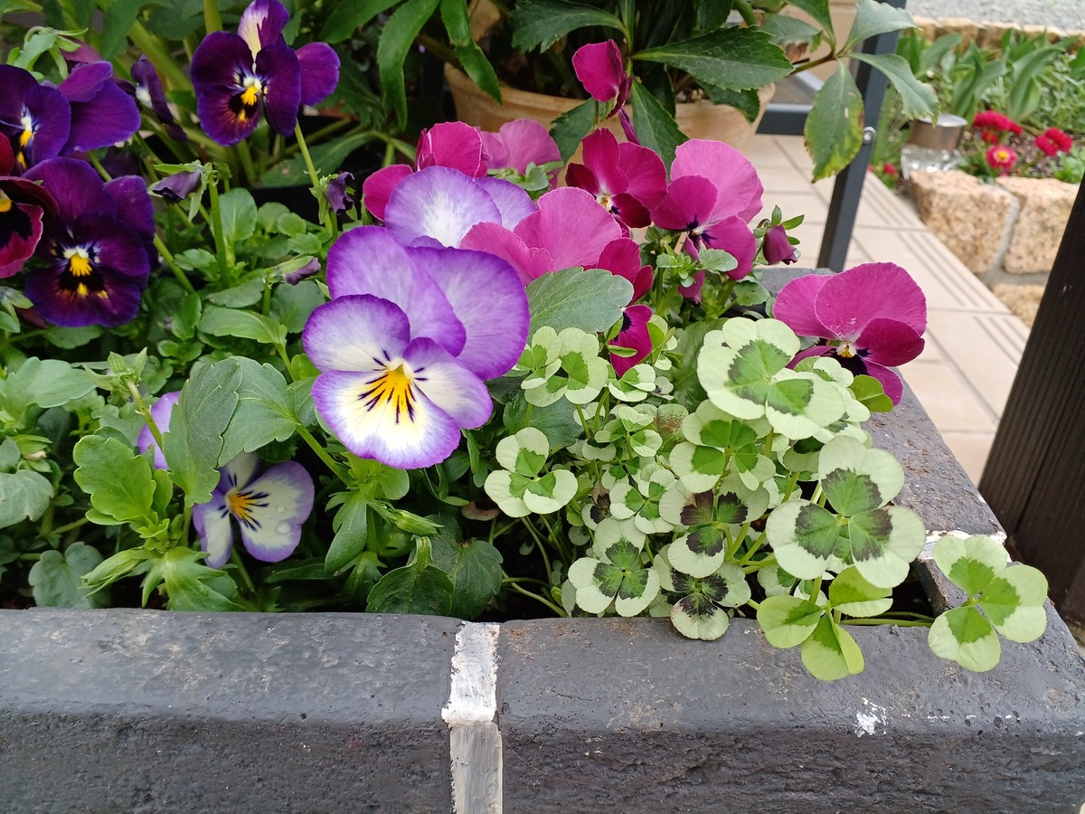 やっぱりパンジーやビオラだけの寄せ植えだけでなく、リーフが入るとパンジーの色が映えますね。💕
