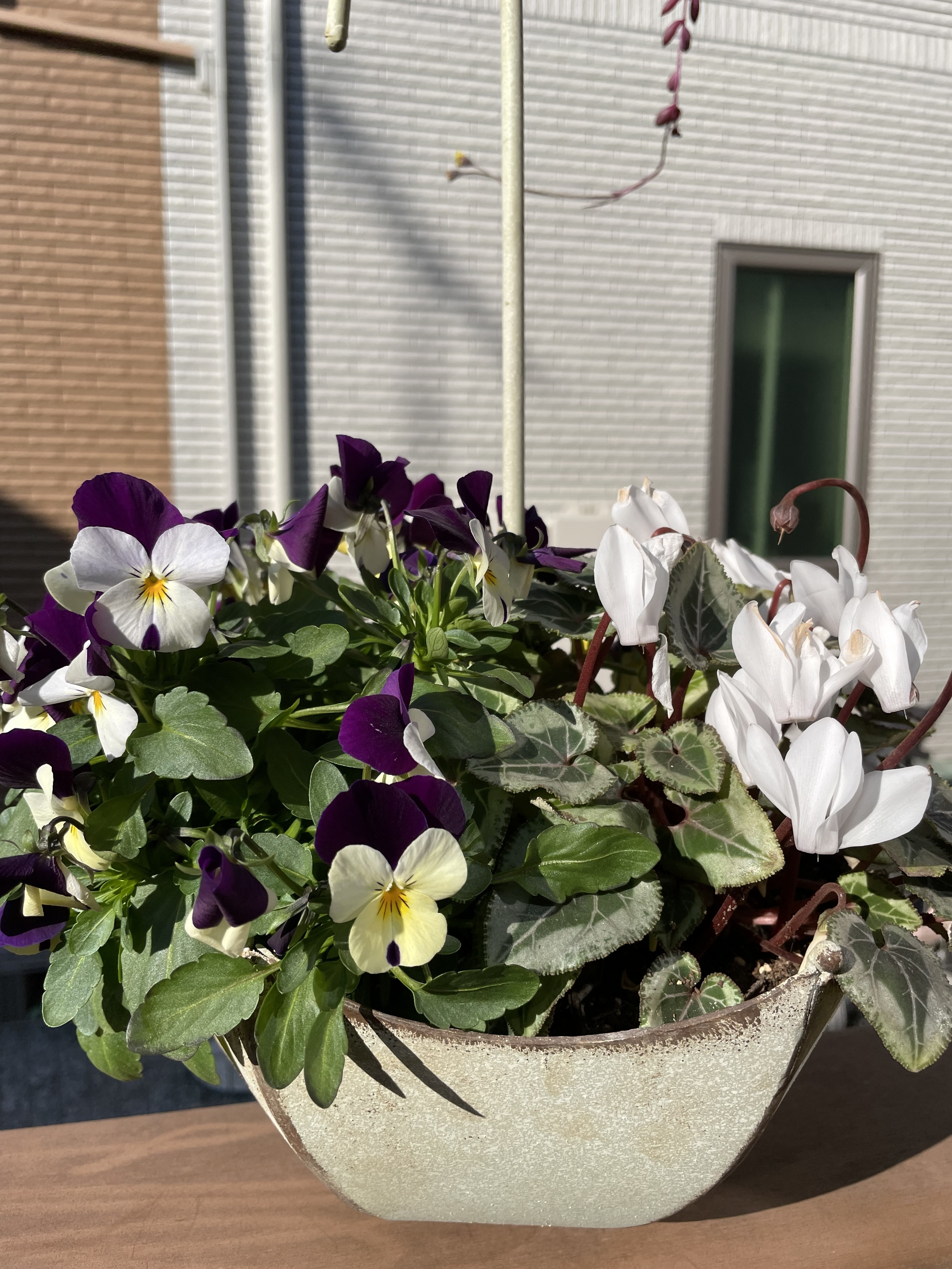 投稿を表示こんばんは🍀。アンブレラの鉢可愛い🎶ですよね💞。昨年のGWポーチュラカの寄植えの時この鉢でした☺️。置いても吊るしても💞白のシクラメンとビオラ✨素敵💜🤍ですね。