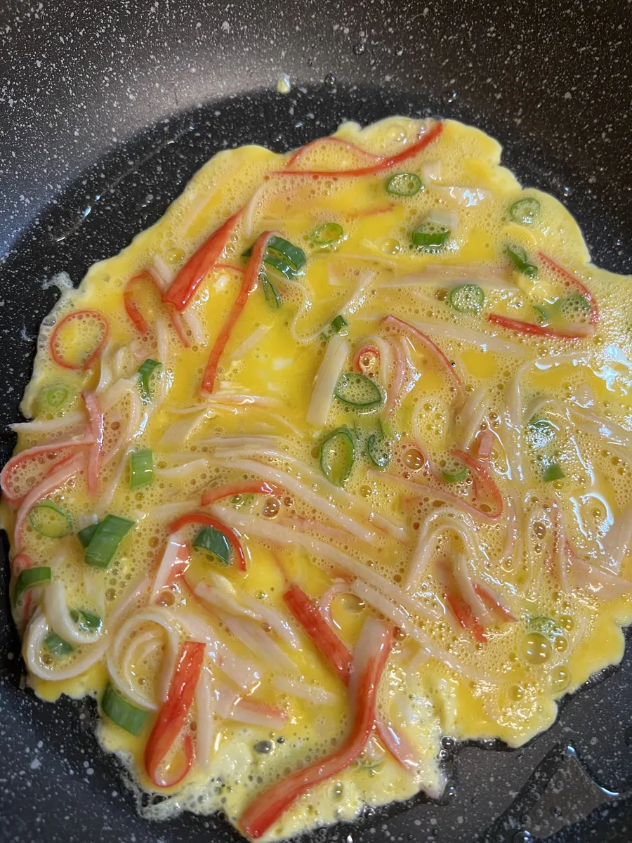 ③卵2個に少量の酢を入れしっかり混ぜて高温に熱したフライパンに流し込み半熟になったら火を止める。
