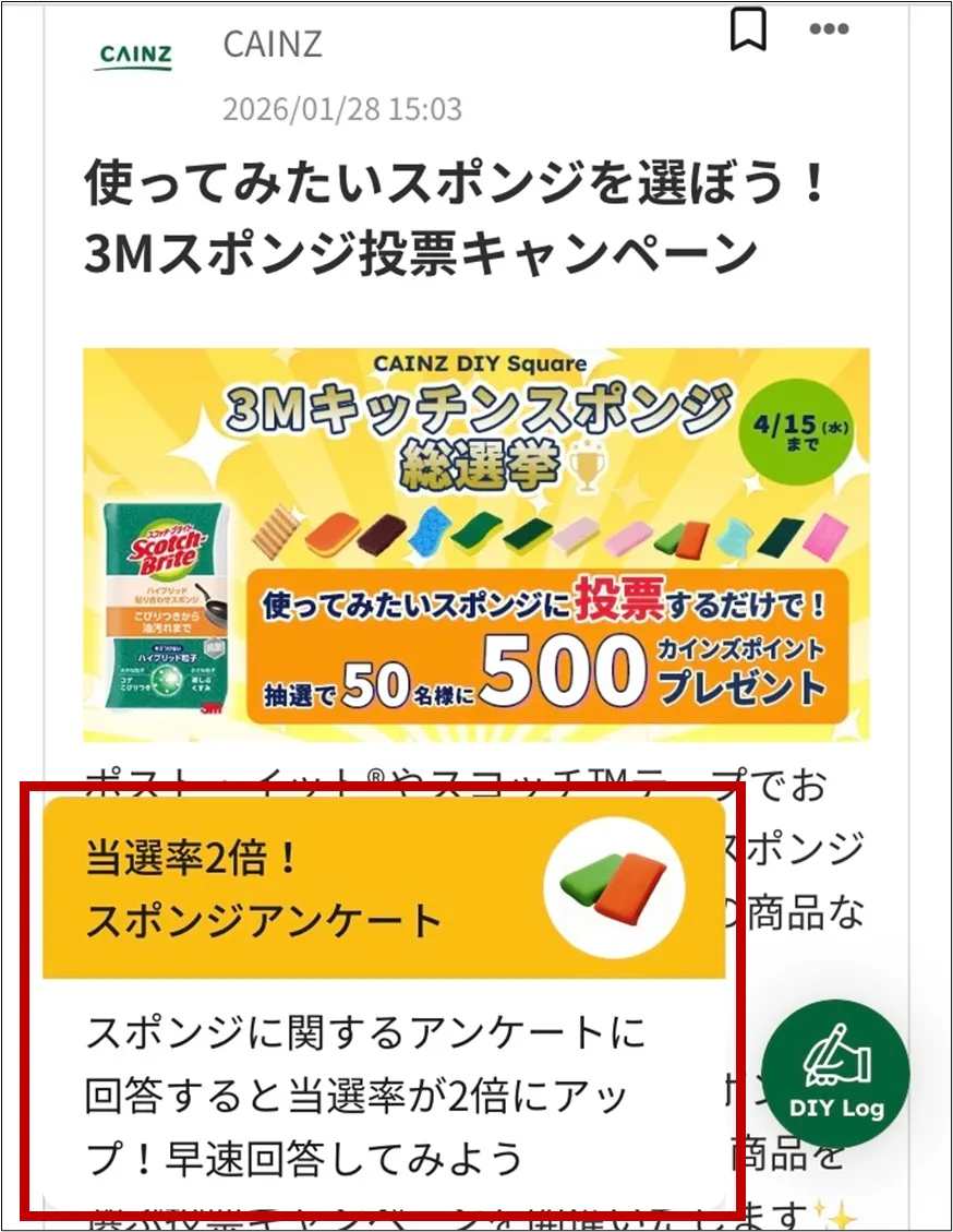 ①「スポンジアンケート」のポップアップをタップ CAINZ DIY Squareにログインし、左下に表示されている「スポンジアンケート」のポップアップをタップ ※「スポンジアンケート」のポップアップはCAINZ DIY Squareにログインをしないと表示されません |