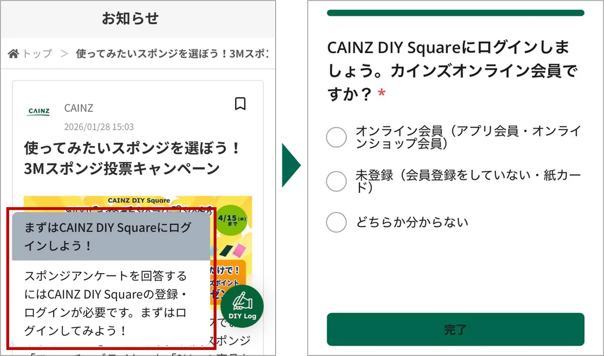 まだCAINZ DIY Squareにご登録がない方、ログインをしていない方は、ログイン後にアンケートにご回答ください。