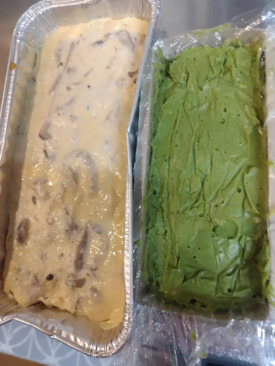 抹茶は混ぜ合わせて冷やし、きのこは、煮詰めて材料と混ぜオーブンで固めました😊