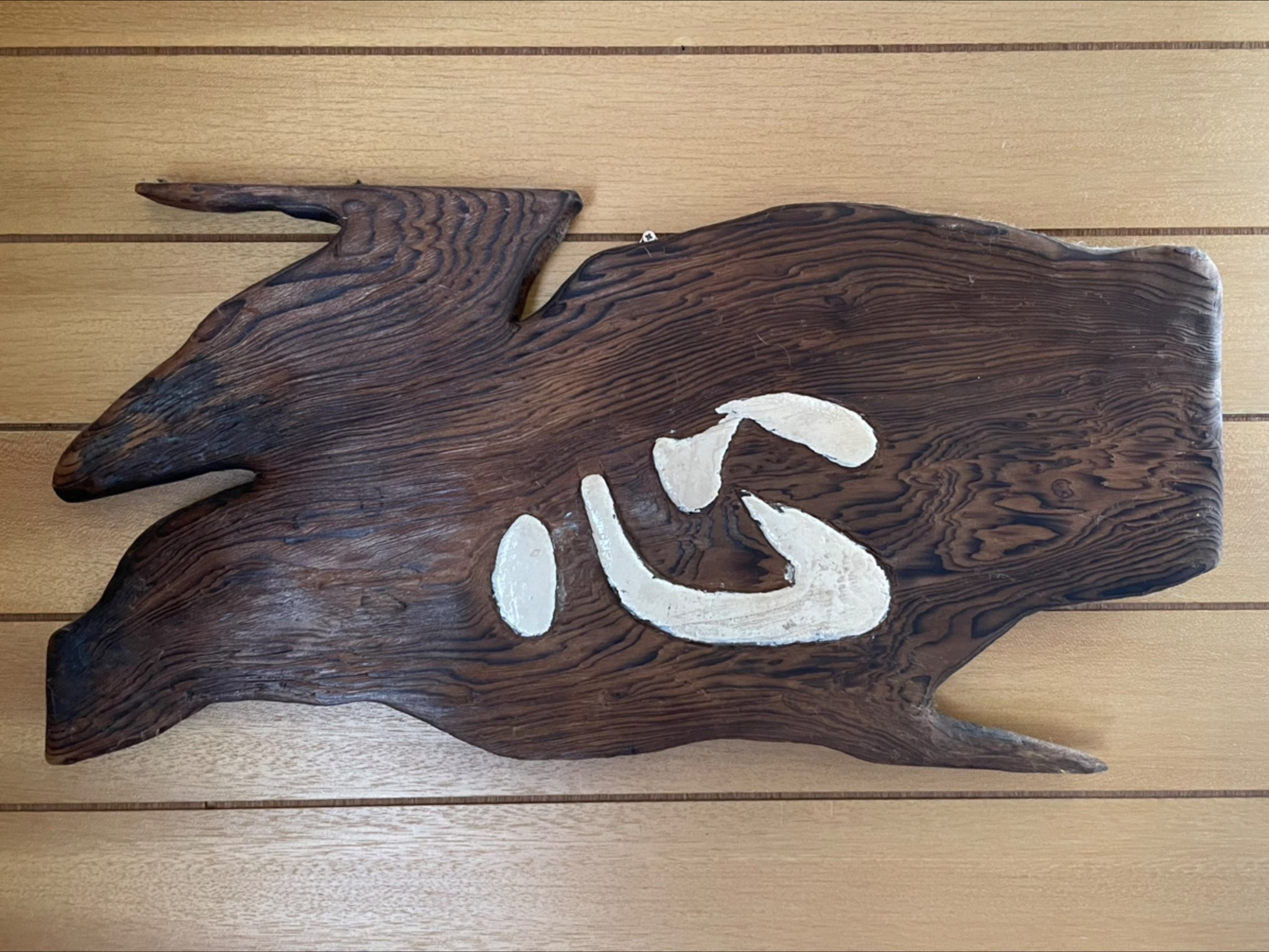 中学校の図工の授業で、杉の平板(25㍉厚)に一文字書いて、文字が浮き立つように削って、縁取りを考えてカット、ガスバーナーで焦がして、ワイヤーブラシで擦って、文字以外の木目を際立たせて、最後に白ペンキで文字をなぞる。