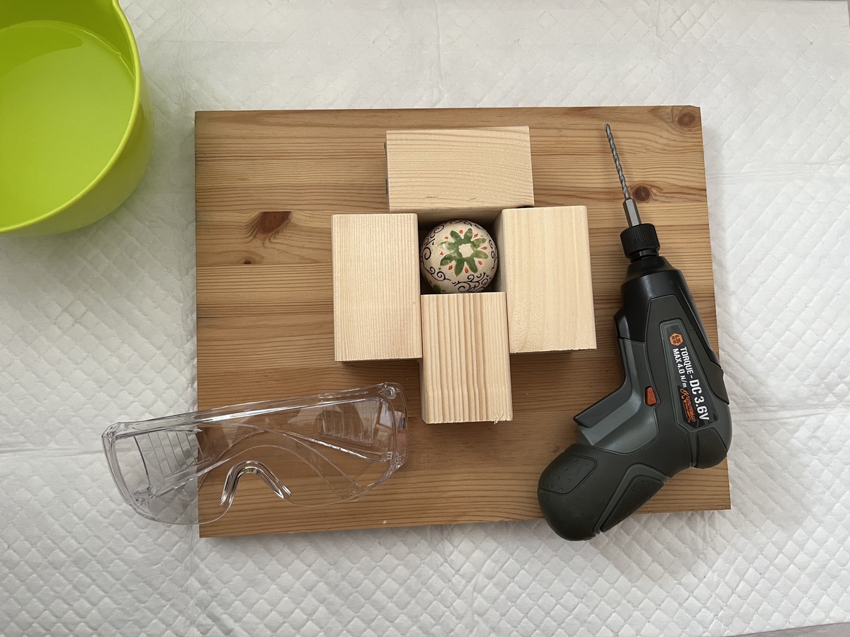 初めから、ドリルで開けようとしても、硬いしツルッと滑るので、目打ち→キリで、小さな溝を作ってから、ドリルで開けていきました🥰