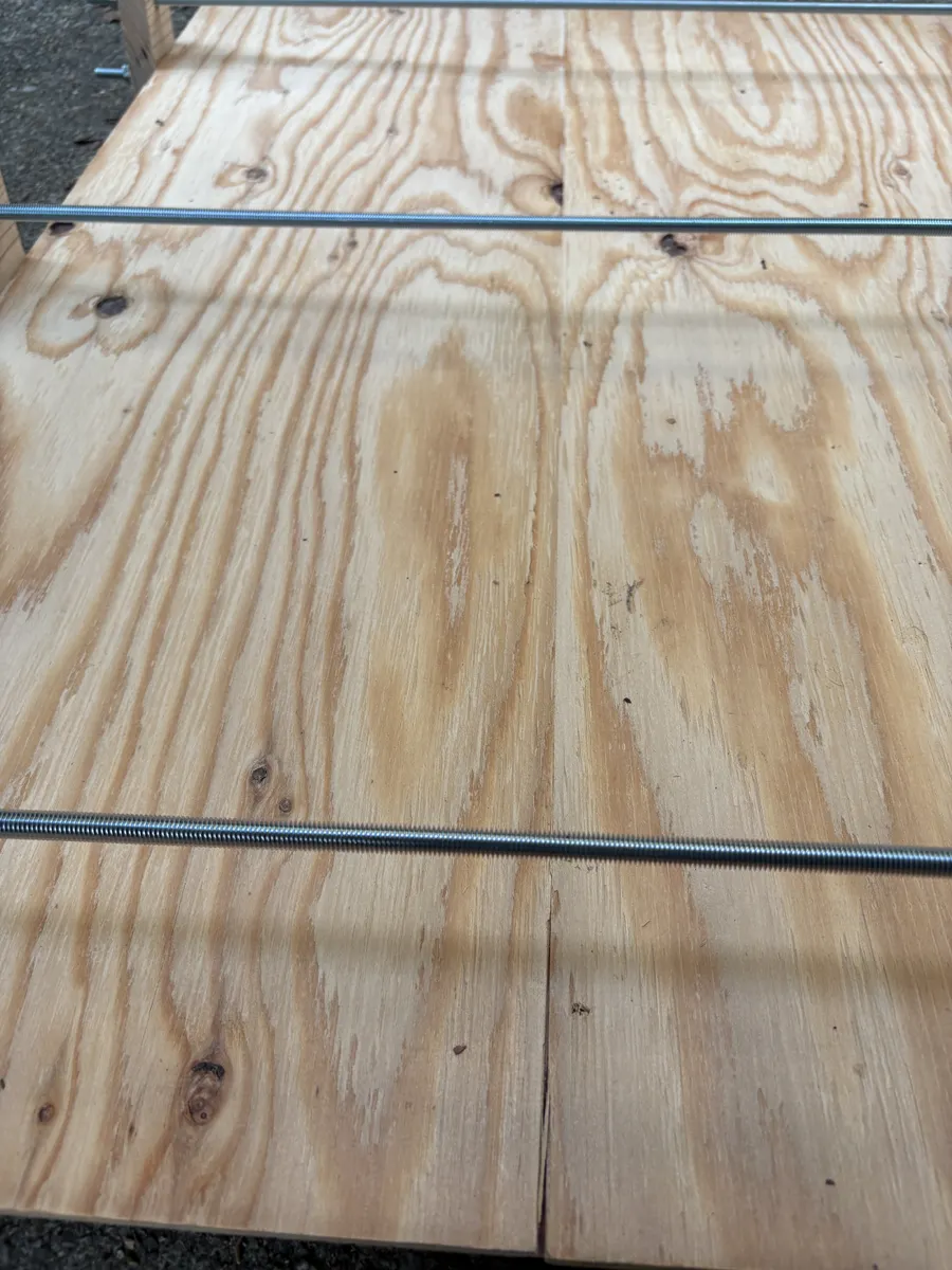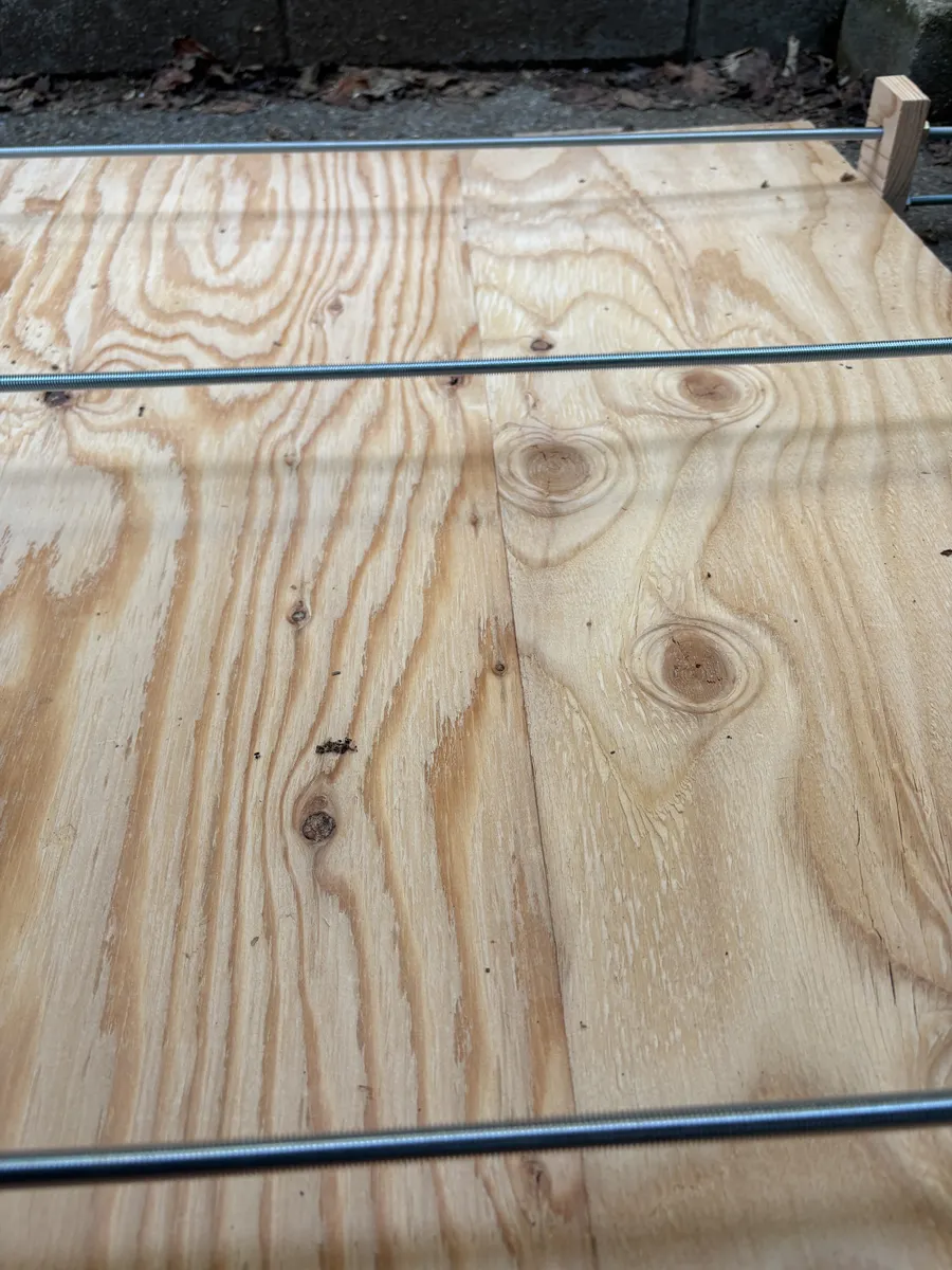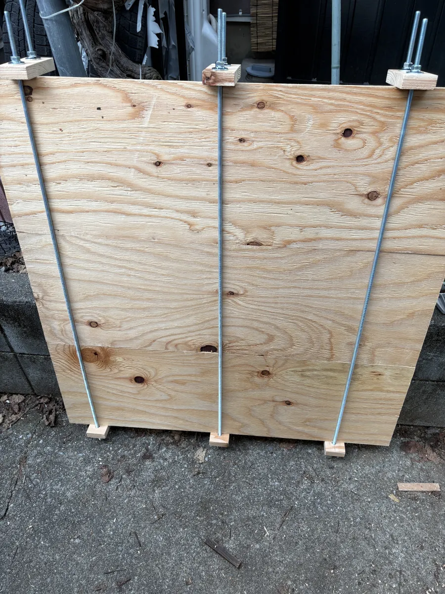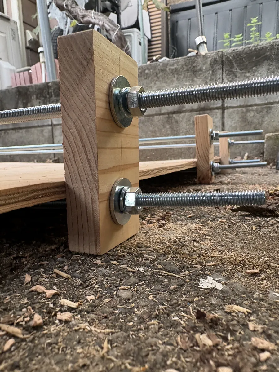 穴が空いたら板に長ボルトを2本通し座金・ワッシャー・ナットの順に組み完成