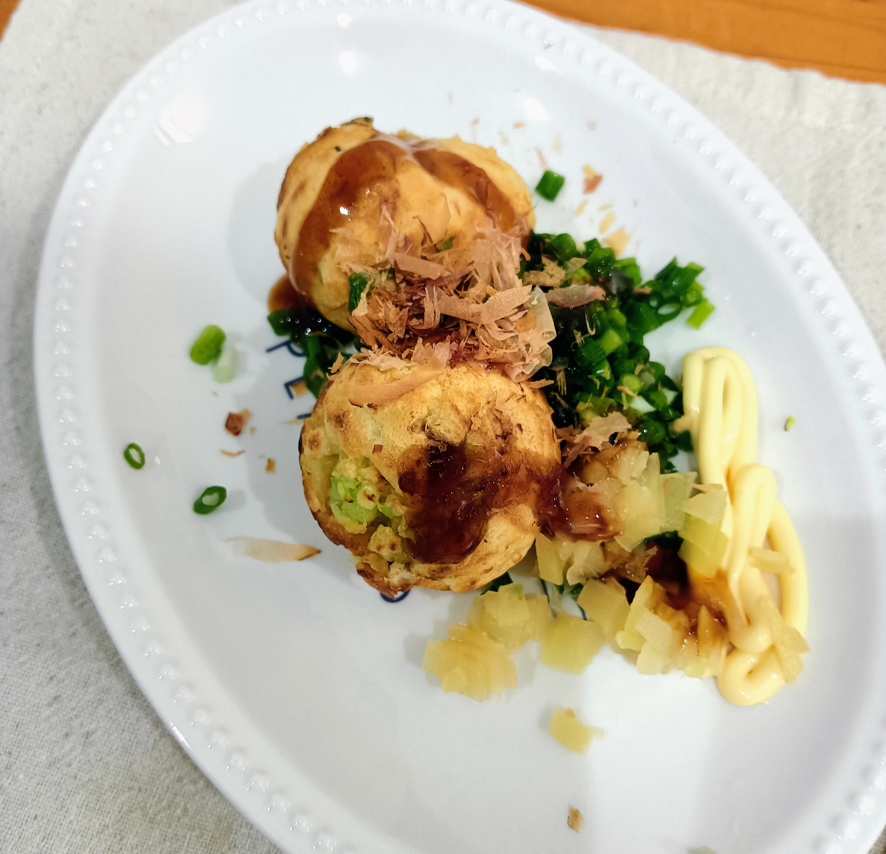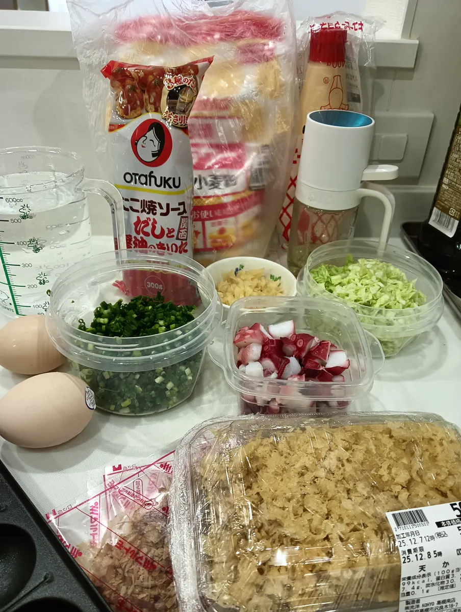 トップ > クッキング > 料理 > 今日のランチは久々のたこ焼きでした。 まっさん 2025/12/07 17:11 今日のランチは久々のたこ焼きでした。 引っ越し前の冬に食べて以来だから 2年振り位。 今回は自作の『甘酢生姜』も刻んでつけダレに混ぜました。新鮮薬味ネギも山程用意、((o(´∀`)o))ワクワクしました。 たこ焼きを焼くのは息子の方が上手いので、完全お任せ。 『私、食べる人』偶にはやってみたいですね。のんびりランチ、楽しかったです。😊 いいね 共有する 共有する X LINE リンクをコピー コメントする 0 件の返信 (新着順)