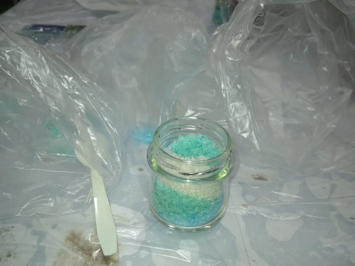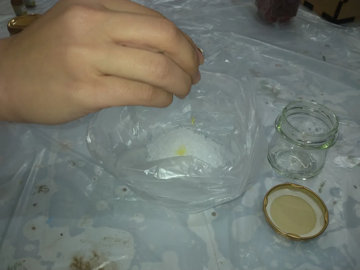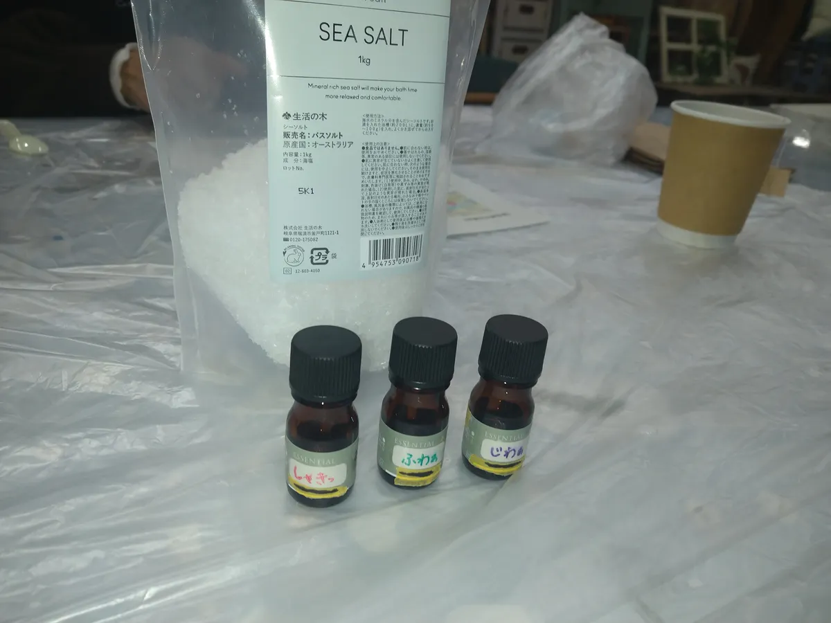 シーソルトを袋に移し、アロマを入れたらシャカシャカします。