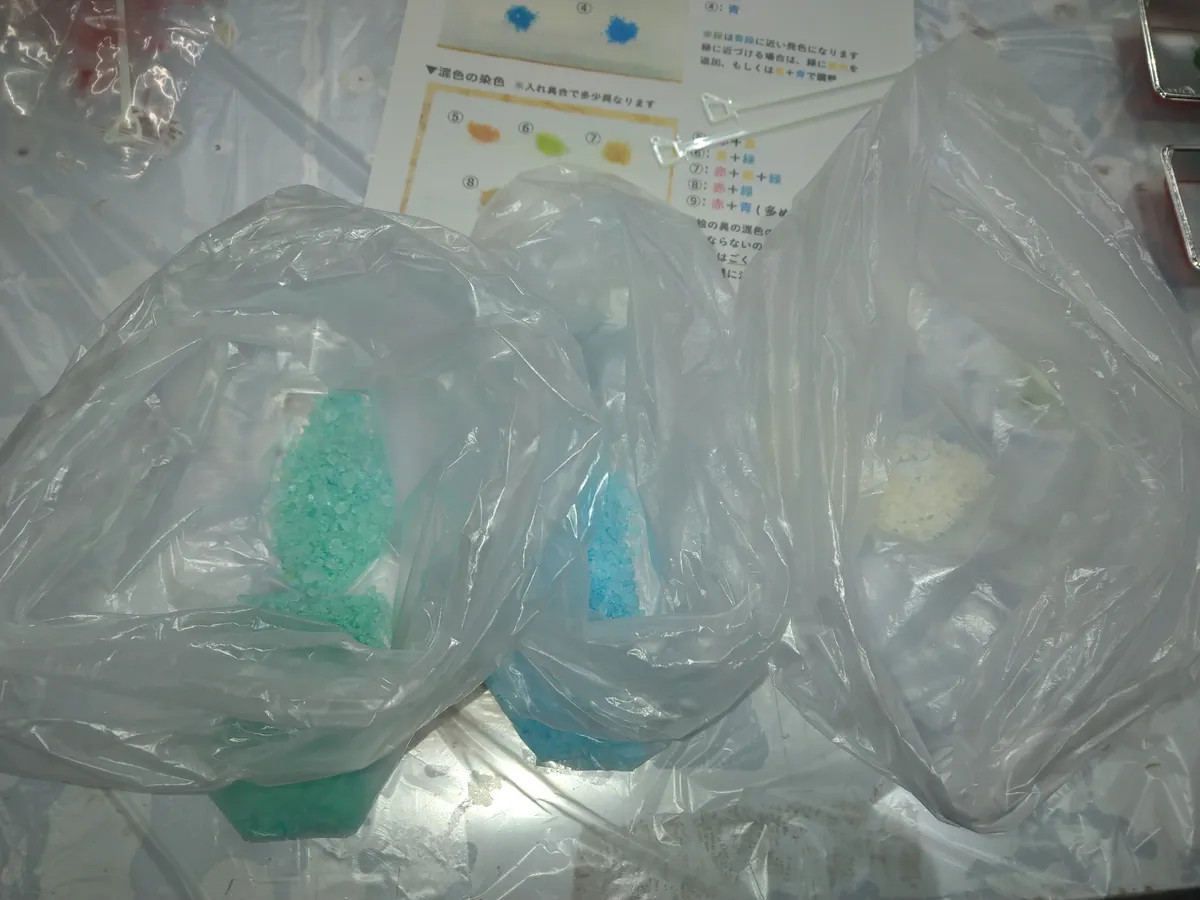 3色作りました✨右は薄い黄色、真ん中は青、左のエメラルドグリーンは青と黄を混ぜて作りました。ほんのちょびっとでも結構色が出ます。