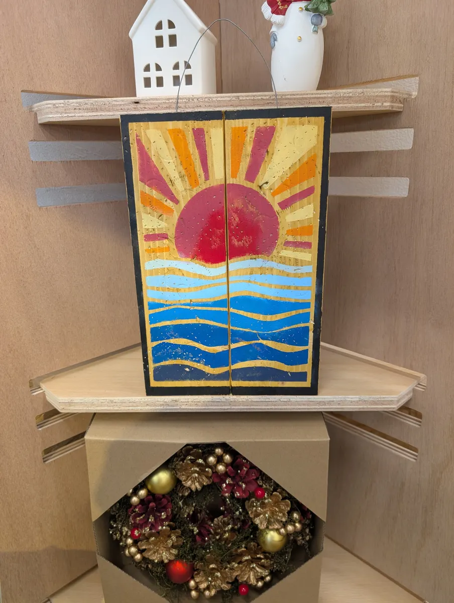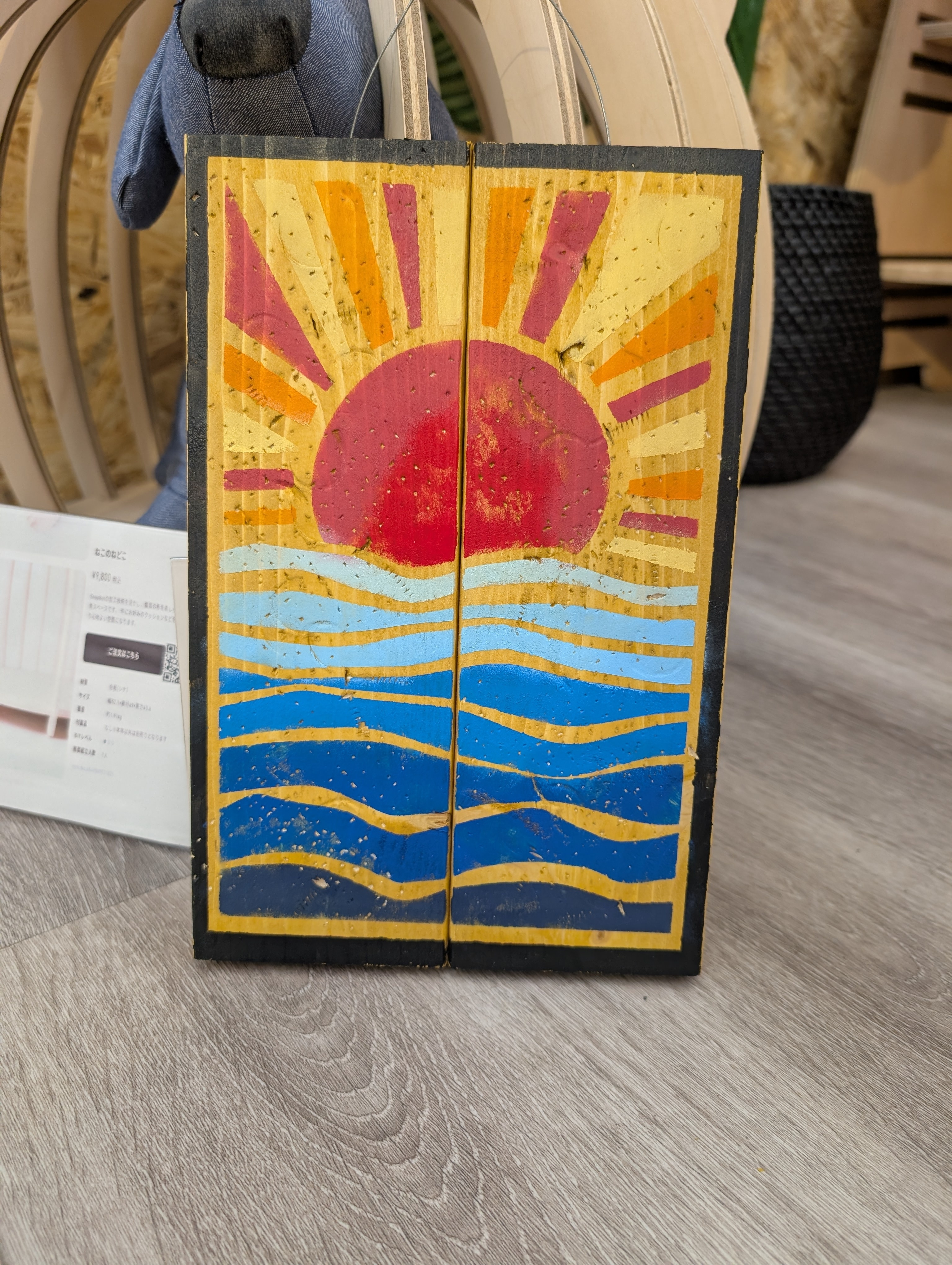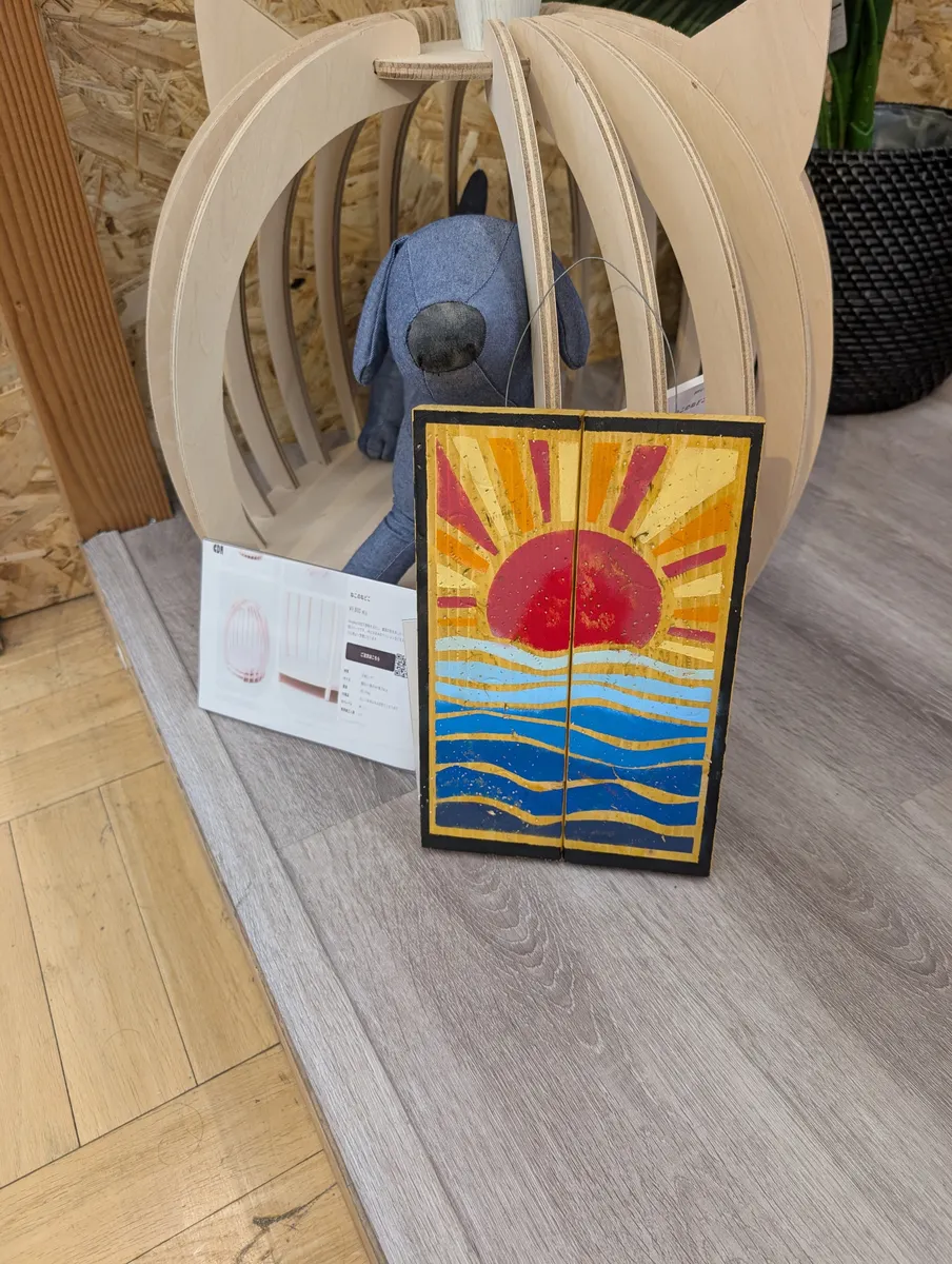 トップ > ワークショップ > 小物・雑貨 > タイニーサインボード その2 おひで 2025/12/01 12:06 タイニーサインボード その2 本日は浜松雄踏店でのワークショップ、タイニーサインボードをまた作ってきました。 今回のテーマは日の出。日の出っぽく仕上げることは決めていたけど、具体的にどうするかは保留にしてあったんですが、シートを取り付けてる時に、「これ、花札🎴っぽくならないか?」と思って、黒枠をつけてみました。 色柄は最大限に使って仕上げたので、めちゃくちゃ豪華な仕上がりになりました。 ただ、飾るとこは考えないとね。 いいね 共有する 共有する X LINE リンクをコピー コメントする 2 件の返信 (新着順) ミュートしたユーザーの投稿です。 投稿を表示 ちわ 2025/12/01 19:44 ほんと花札っぽいですね 色のインパクトがいいです😉👍✨ いいね 返信する ミュートしたユーザーの投稿です。 投稿を表示 おひで 2025/12/03 10:59 ちわ イメージ先行で思いついたので、アドバイザーさんと「あれ?」、「あれ?」って感じでグーグル先生使ってやっと🎴が出てきた次第。「(なんとか)札」までは出てたんだけど。 で、どうせやるなら振り切ってやっちゃえ、って感じでインパクト強めでお送りしてます。 いいね 返信する ミュートしたユーザーの投稿です。 投稿を表示 きゃな 2025/12/01 13:37 すごい和風でいいです✨ ご利益ありそうです✨ いいね 返信する ミュートしたユーザーの投稿です。 投稿を表示 はっちゃん 2025/12/03 09:19 きゃな 素敵 いいね 返信する ミュートしたユーザーの投稿です。 投稿を表示 おひで 2025/12/03 10:55 きゃな シートを貼り付けるときに、板とシートの間で隙間があって、それを何か活かせないかと思って考えてるうちに、花札(その時は一瞬出てこなかった、、、こんな感じ🎴で、というイメージ先行。花札🎴が浮かんでね、、、)みたいにしちゃえ、って感じでやってみました。 いいね 返信する ミュートしたユーザーの投稿です。 投稿を表示 きゃな 2025/12/03 11:40 おひで 私もステンシルするとき枠にしてます✨ フレームに見えたりいいですね✨ 伊勢崎店で習得しました✨ いいね 返信する ミュートしたユーザーの投稿です。 投稿を表示 きゃな 2025/12/03 11:41 はっちゃん はっちゃんさんもそうなんですね! 素敵ですよね~💕💕 いいね 返信する