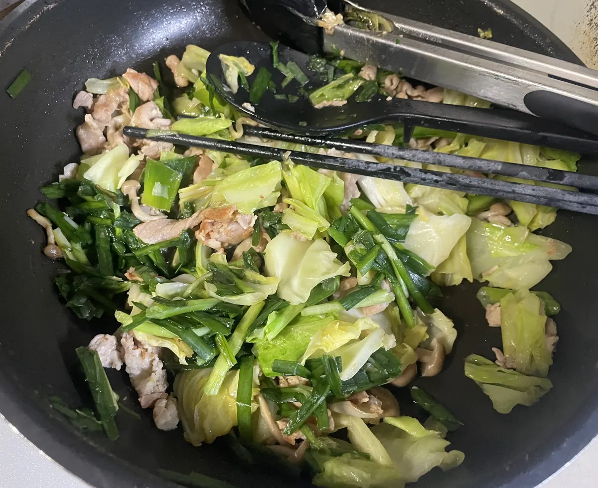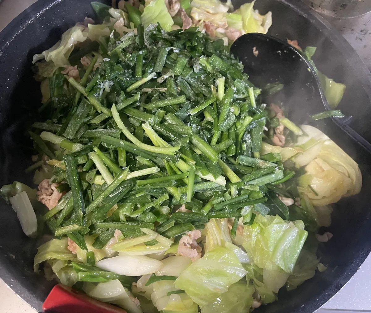 火を消してからニラを入れておくぅ〜💚➰🍳✨