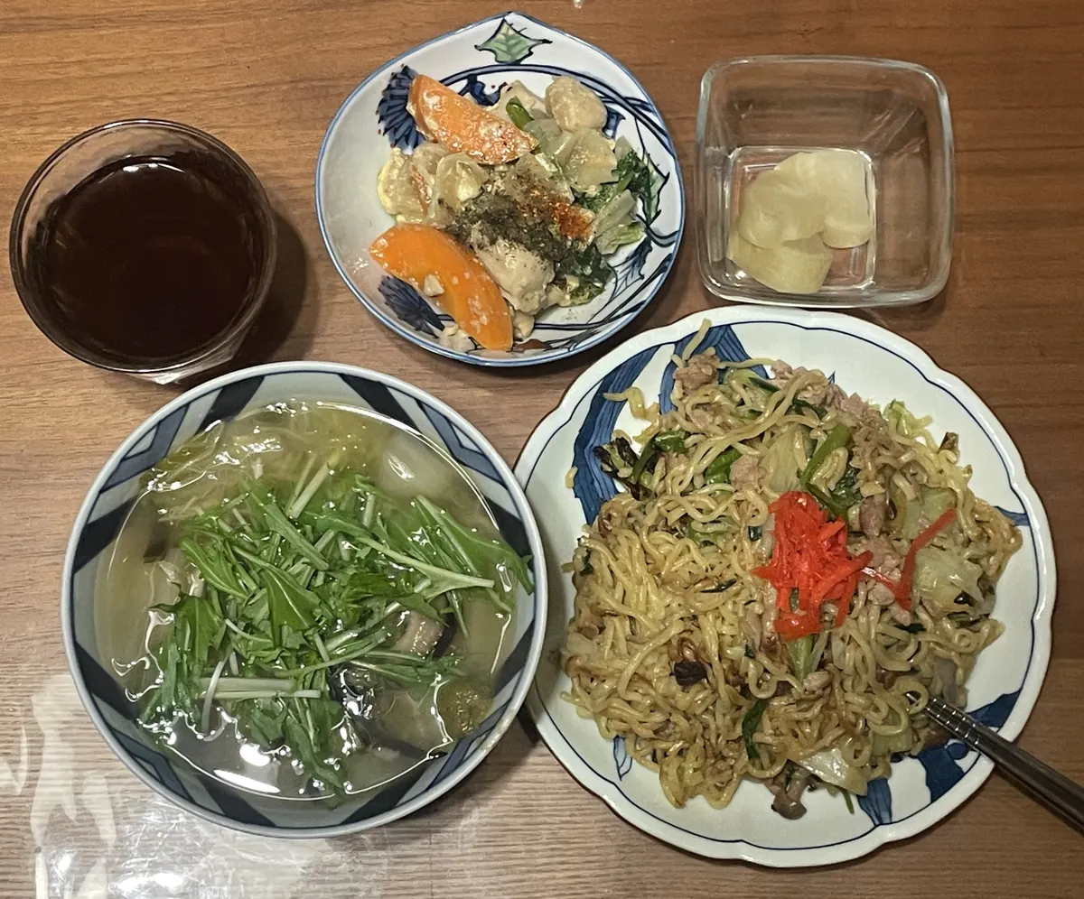 そいなら予定してたお野菜チェンジで、韓国風焼きそばにしようとダシダに合いそうな物にして焼きそば作ったよぉ〜😁👍🇰🇷🐃🍝✨