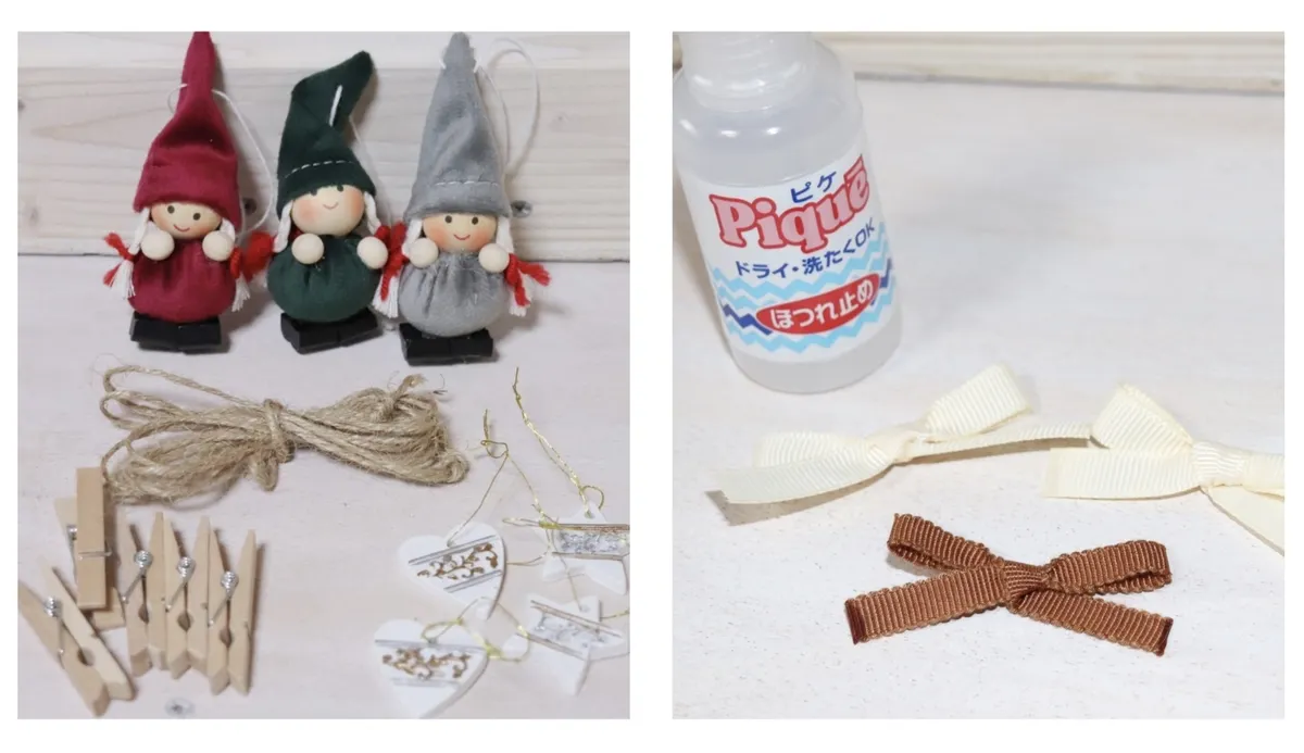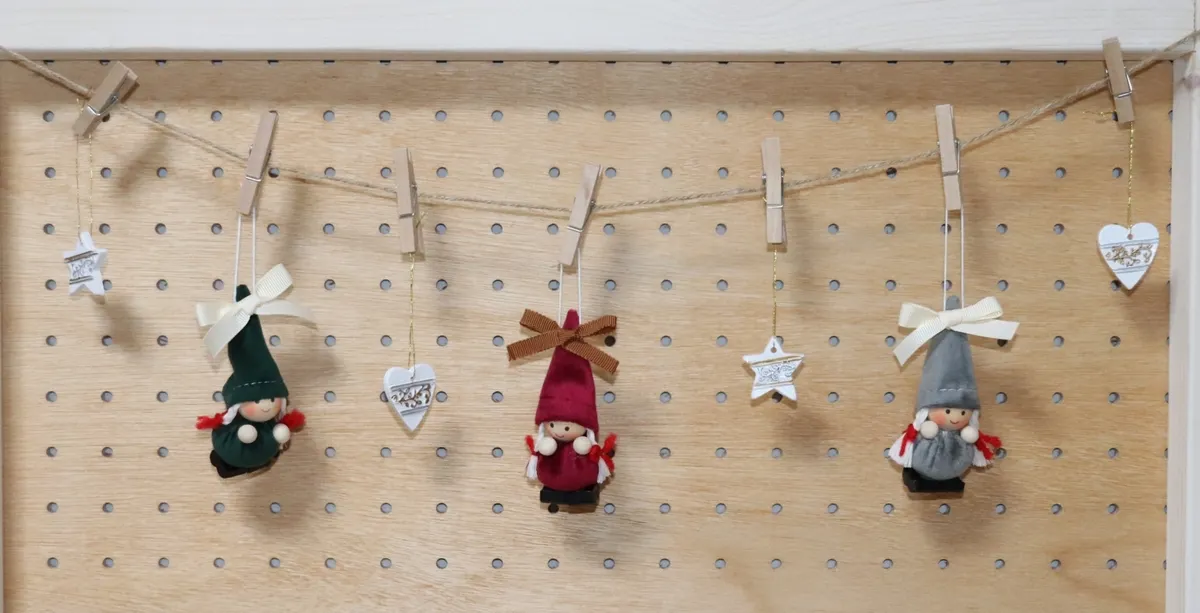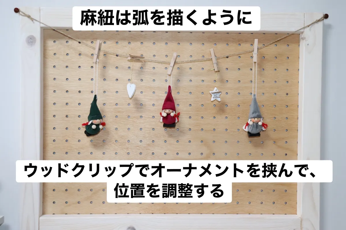 麻紐にウッドクリップを引っ掛け、オーナメントの位置や高さを調整していく