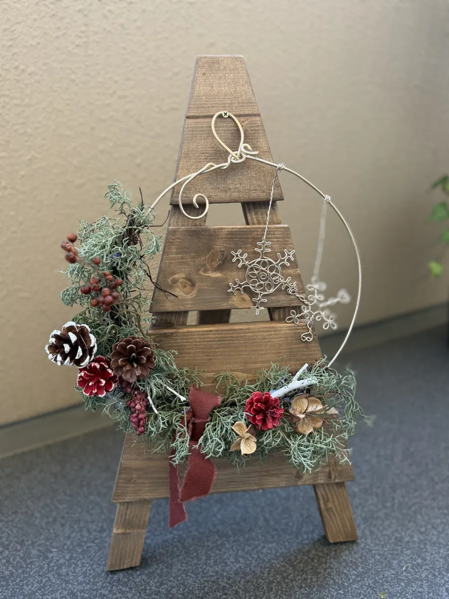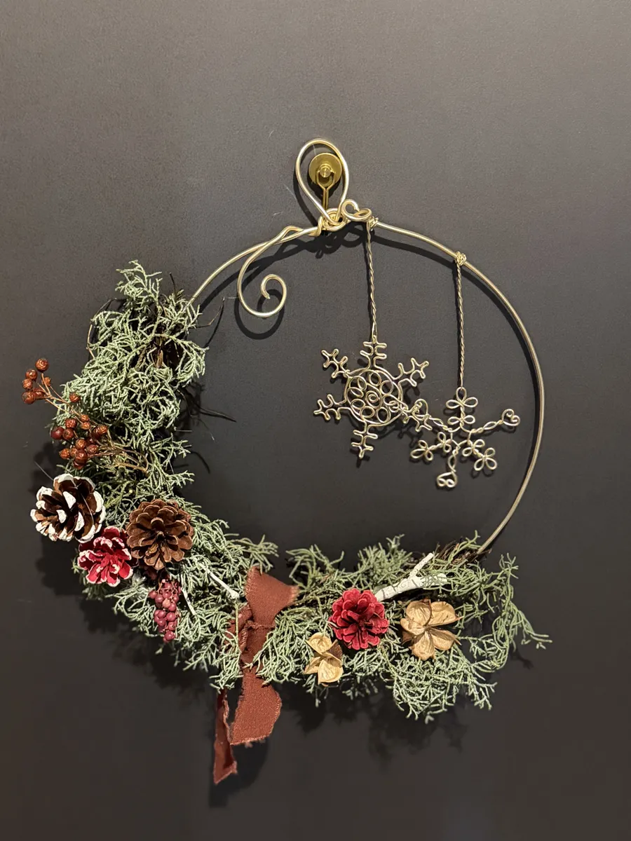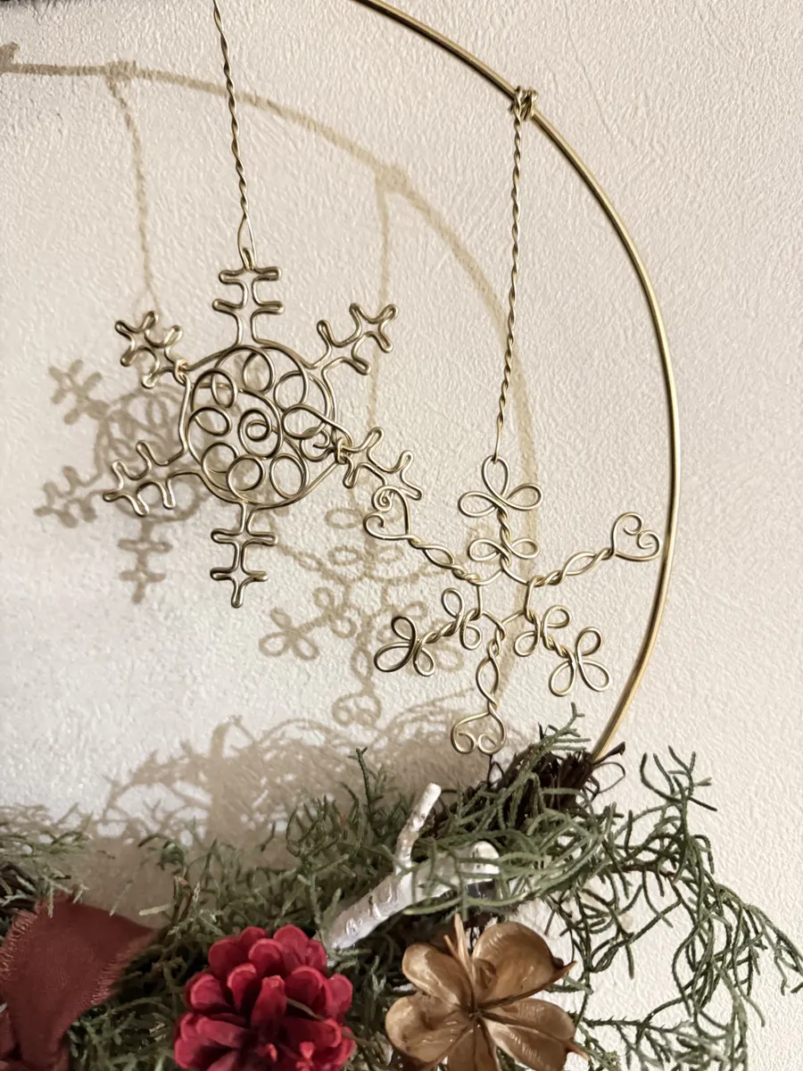 飾りのワンポイントにワイヤーの雪の結晶をぶら下げました。