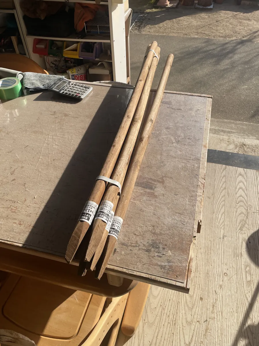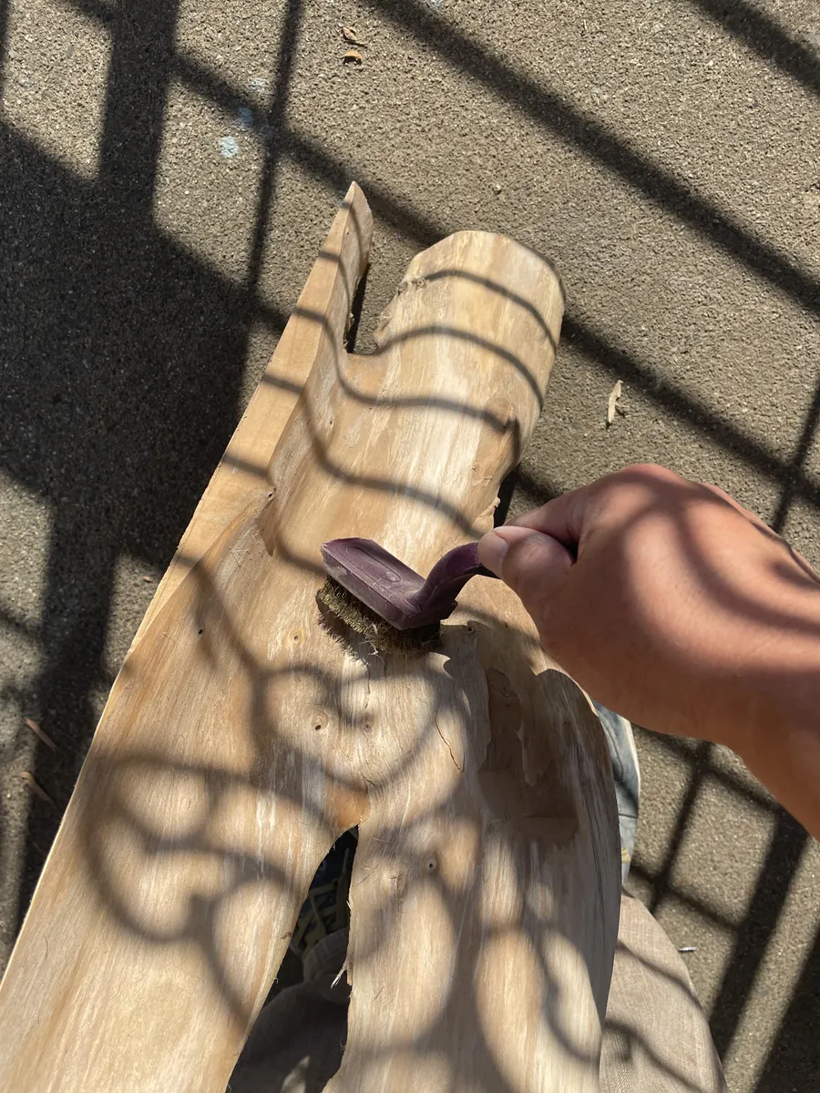 振れ止めの板を探してたら昔イチョウの木の端材を見つけました。今回コチラもWで使っちゃいましょー🤭板の皮剥が大変なので金ブラシで擦りましょー