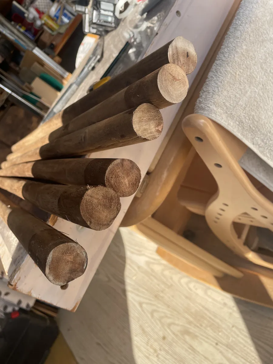今日は丸太のプランターの2作目を湯婆婆さんが作って欲しいとのリクエストがありホームセンターで丸いクイを6本購入して来ました😊