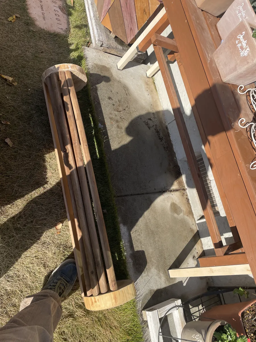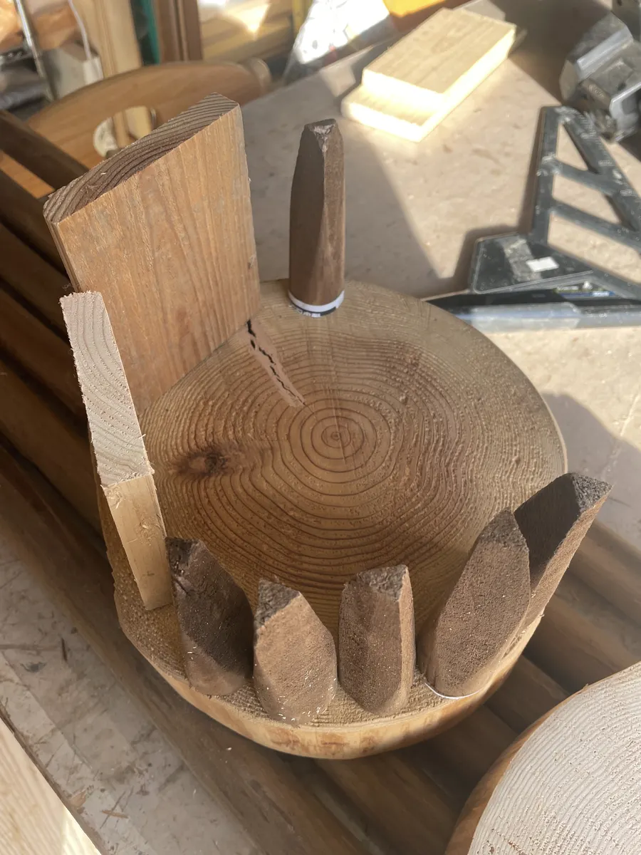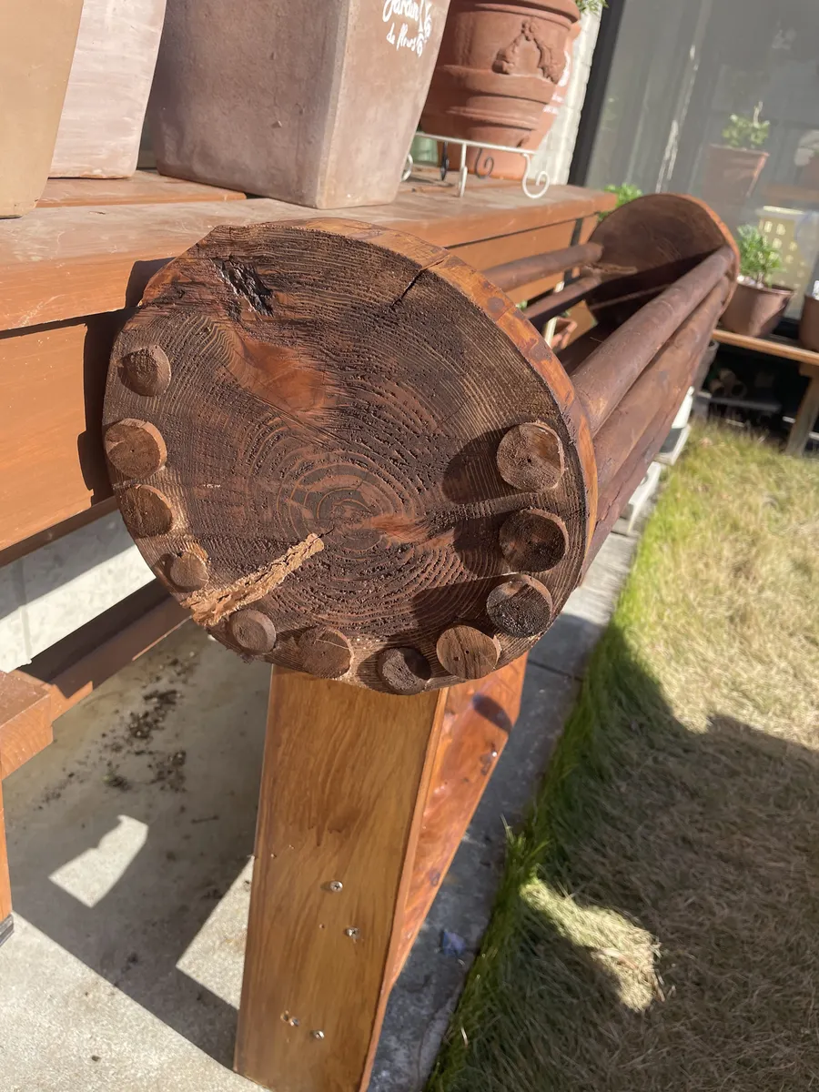 湯婆婆さんにこれ、丸い棒を丸太スライスに貫通してるんだよって言ったら、もう土入れて良い?との事🤭施工方法は全く気にならないんですね笑笑
