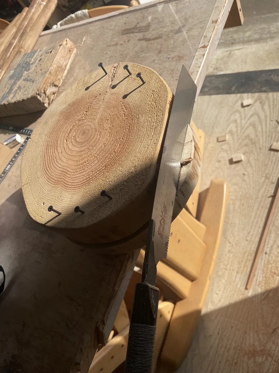 ■作り方 丸太のスライスと丸いクイをねじ止めして脚を付ければ完成