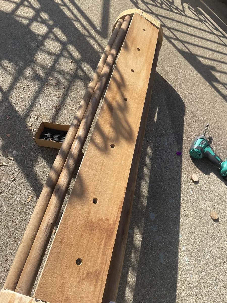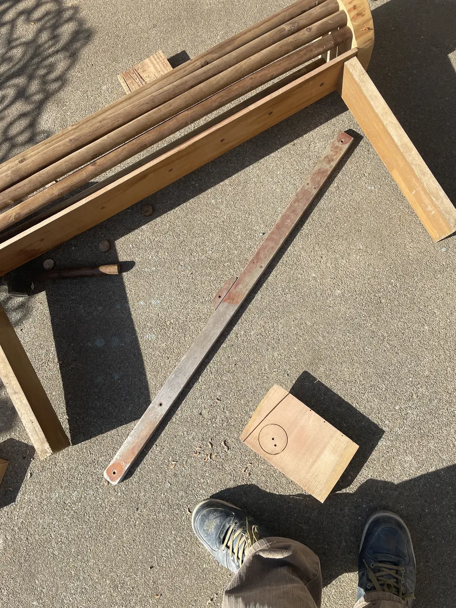 続いて脚になる部分を接合しましたが長さがあるので適当な板で振れ止めをこの板で作りましょう!