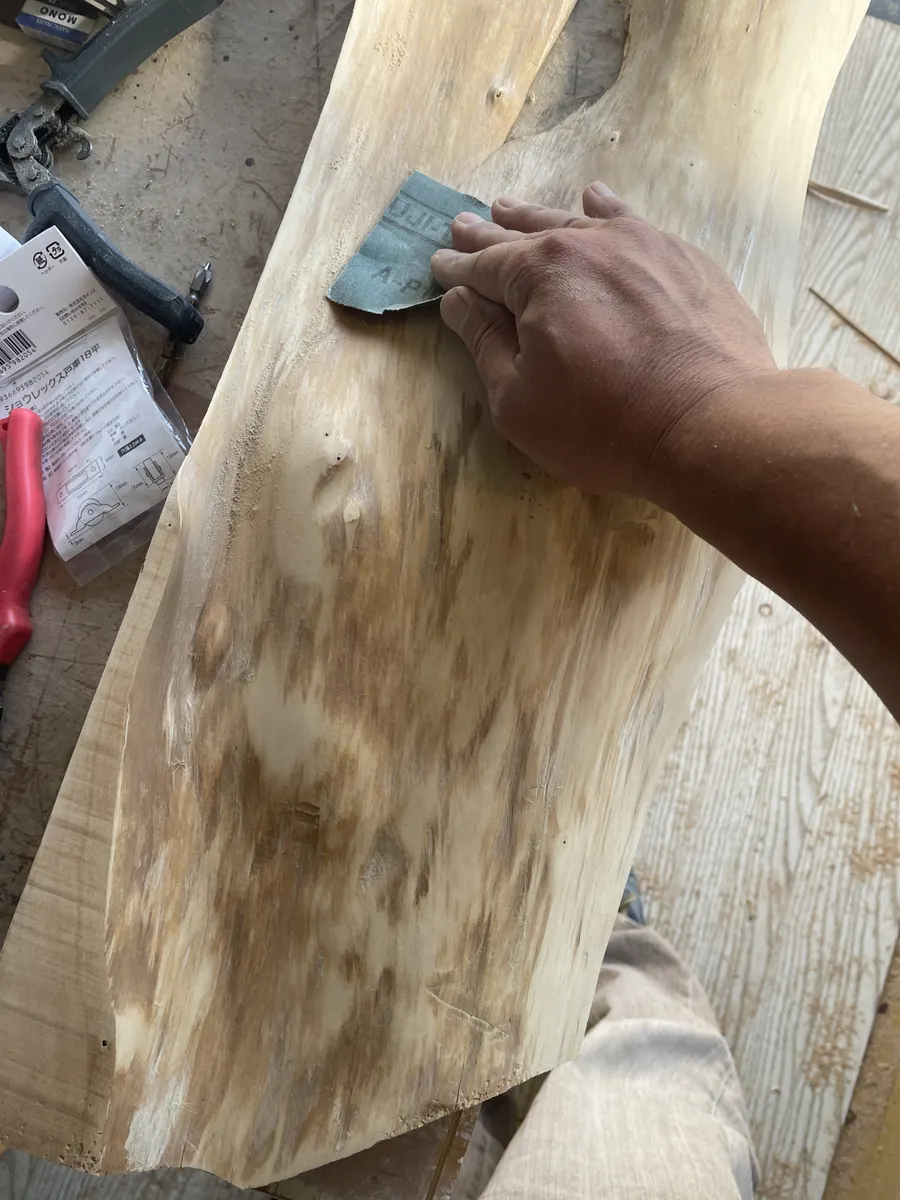 最後は紙やすりでひたすら研磨します。平になってないのでサンダーがイマイチ使えないんですよねー