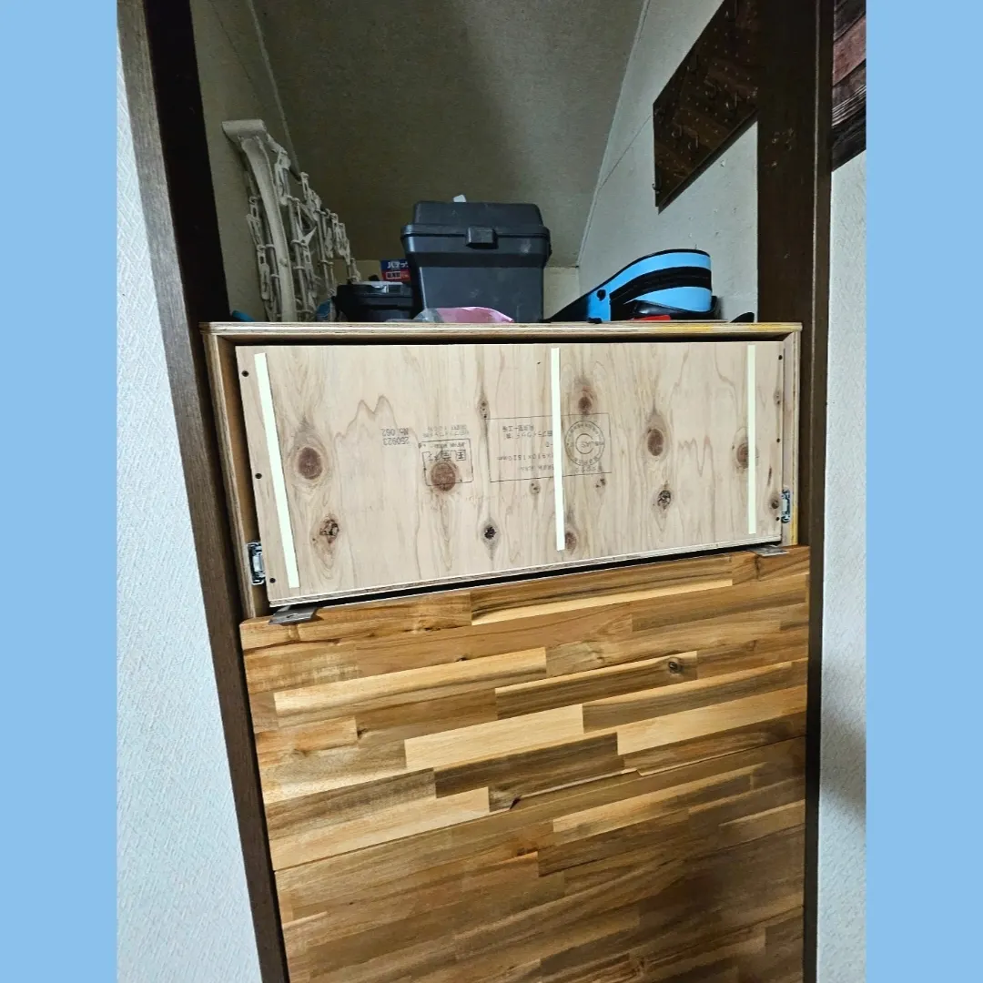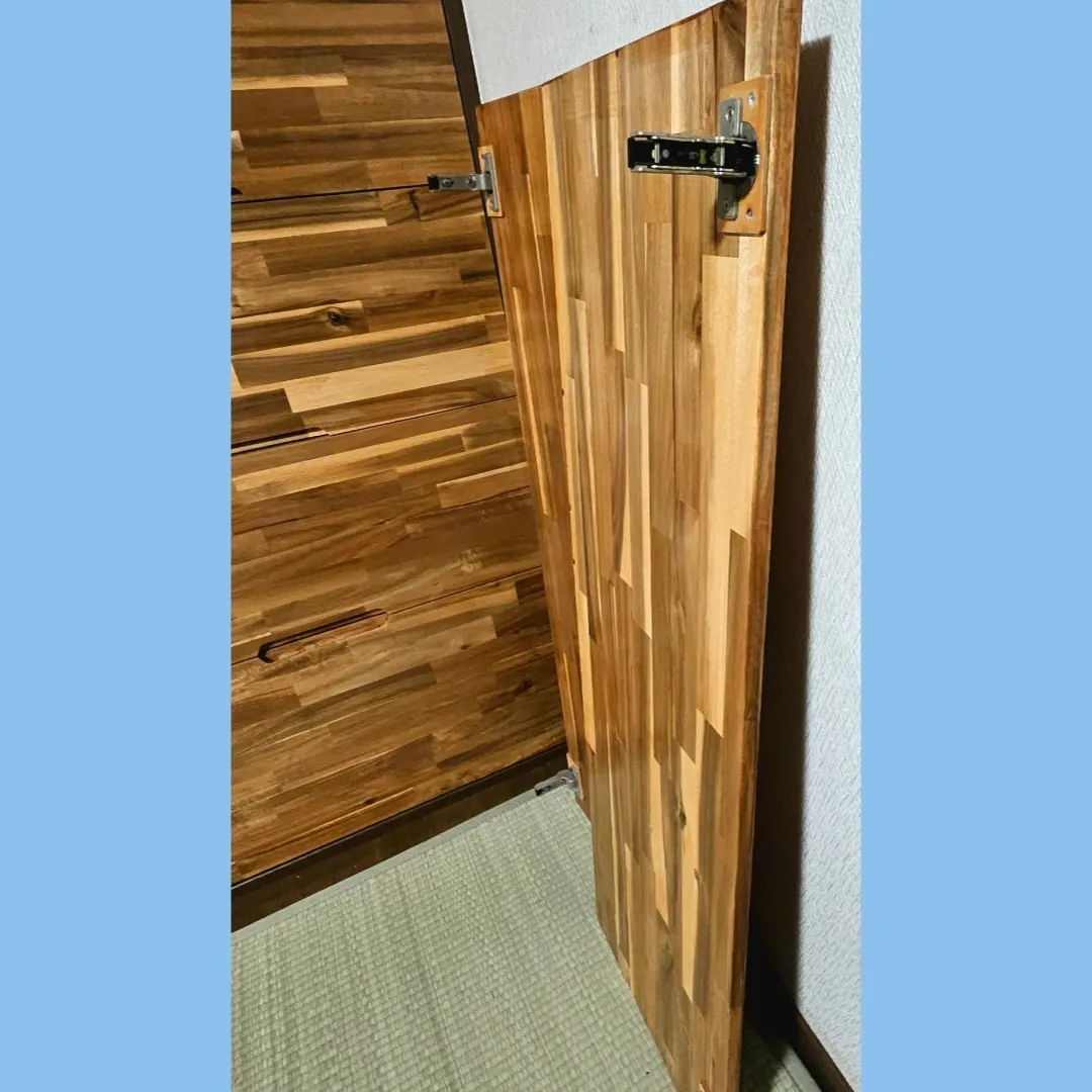 上部観音開き扉は板厚が薄かった為にスライド丁番固定穴が貫通してしまう事が分かり、薄板を1枚かませてあります😉
