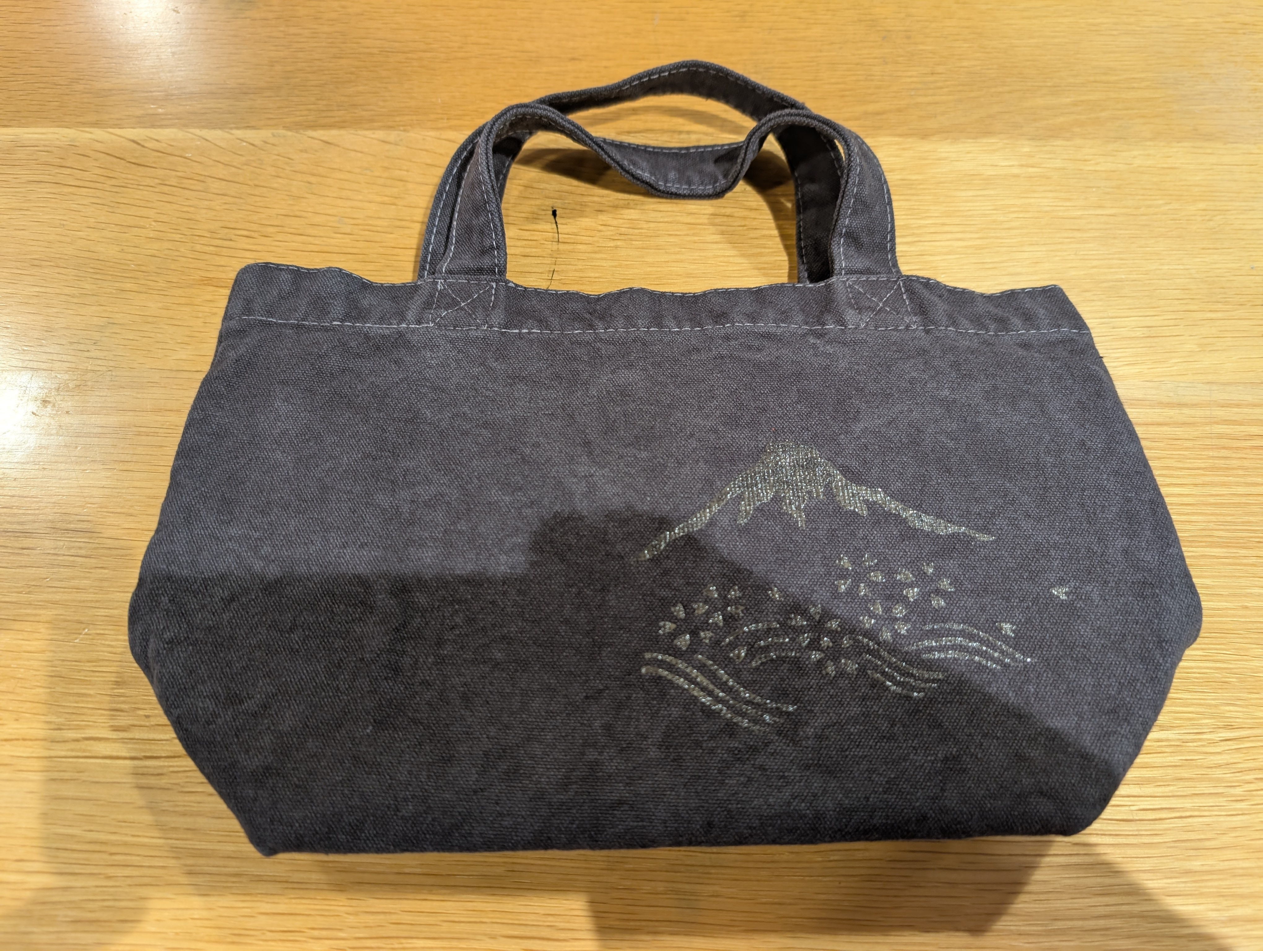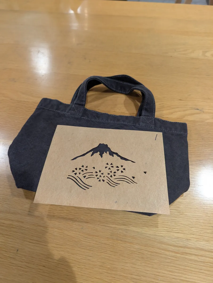 駿府匠宿での3つ目。トートバッグでお手軽に体験できるものがあって、あらかじめお茶染めしてあるところに型紙でノリをつけて抜染をするというものがありました。