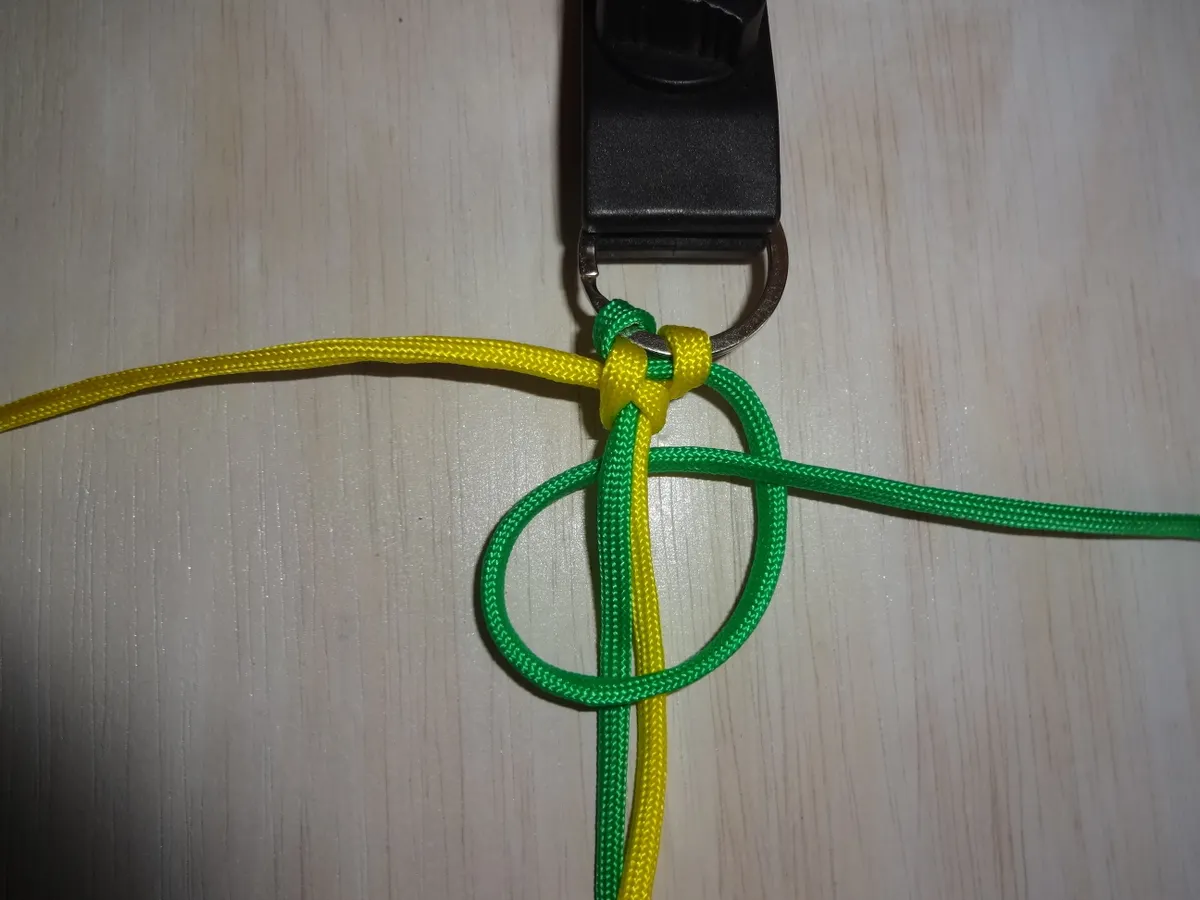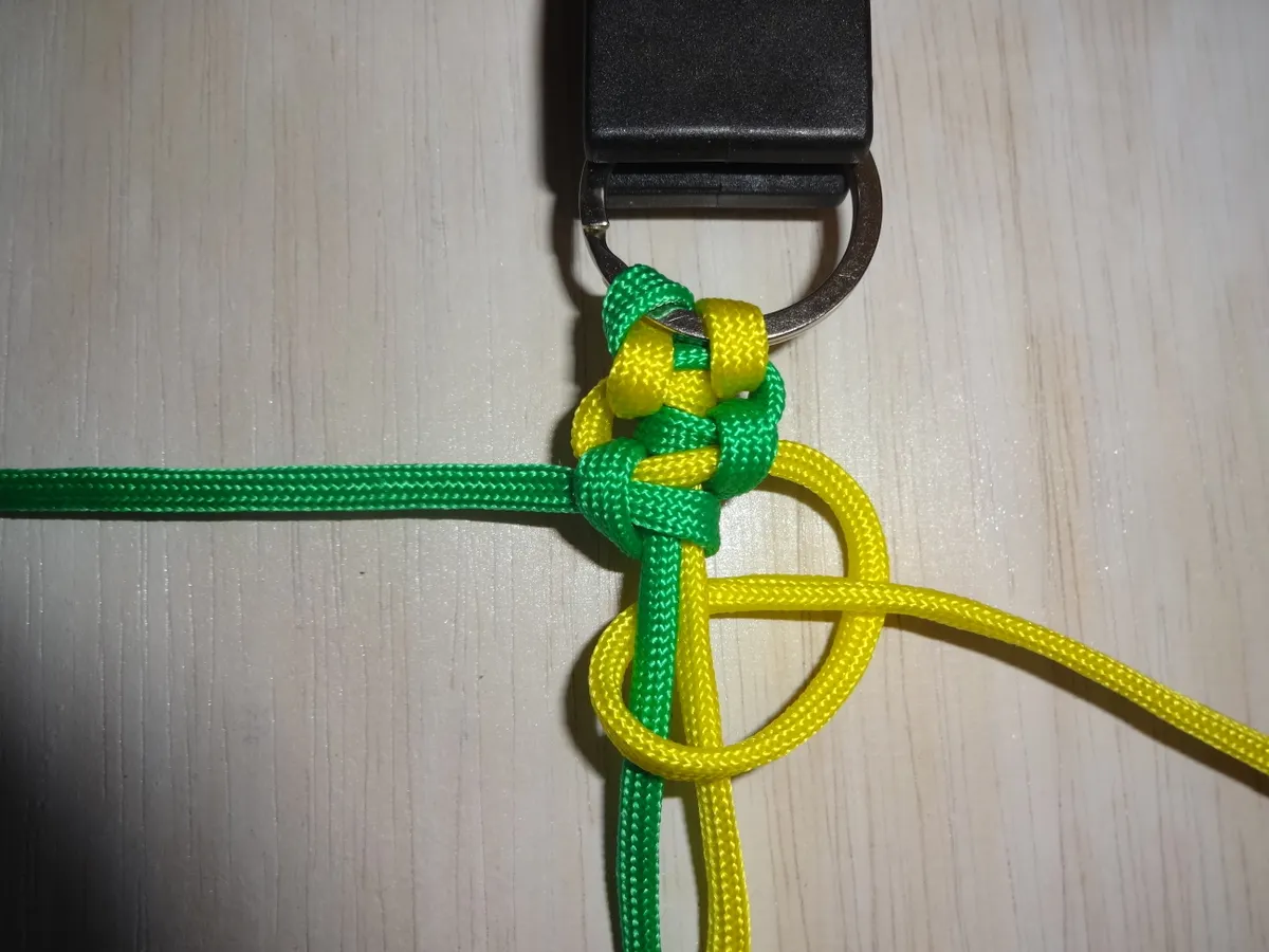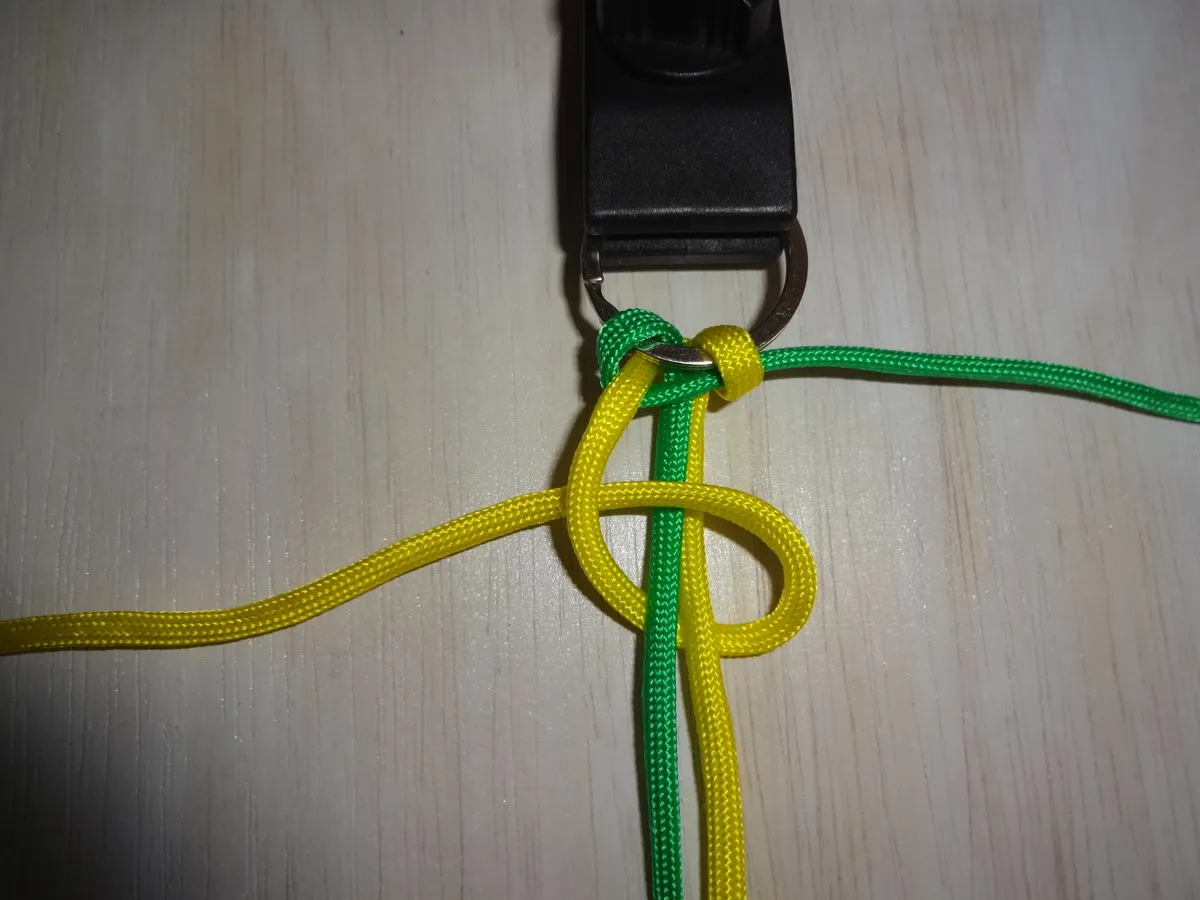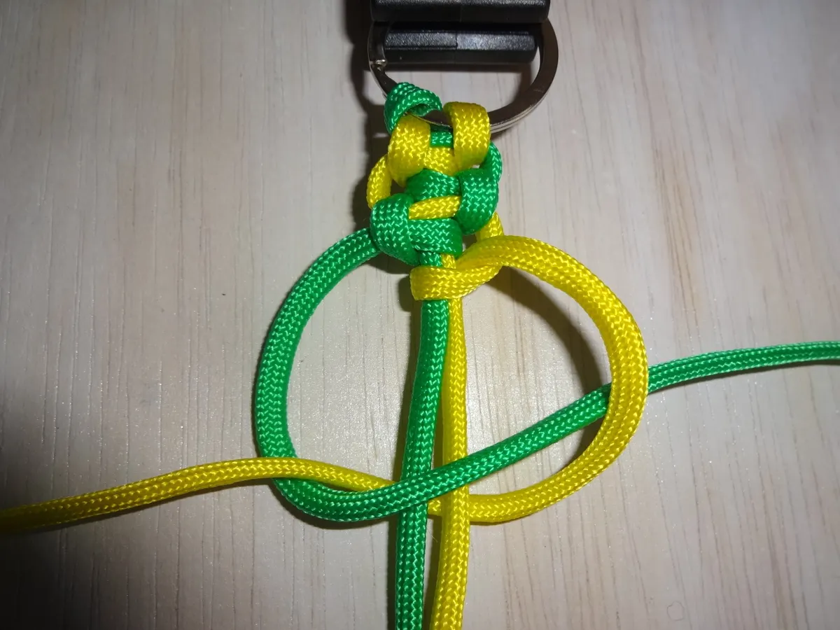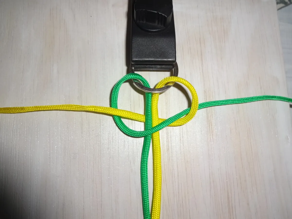 ↓ 黄を下側から図の様に 1巻き 通します。左側は緑に変わっても同じ 1巻き です。