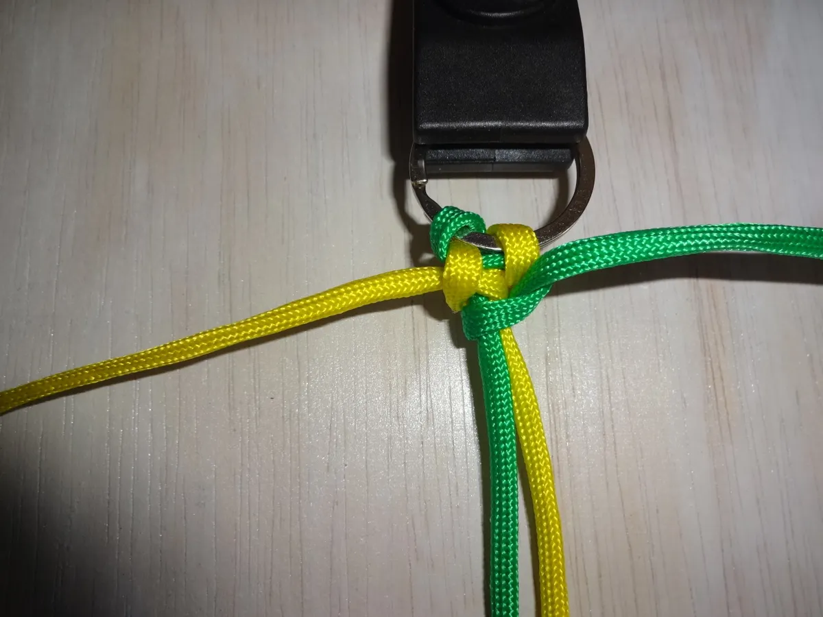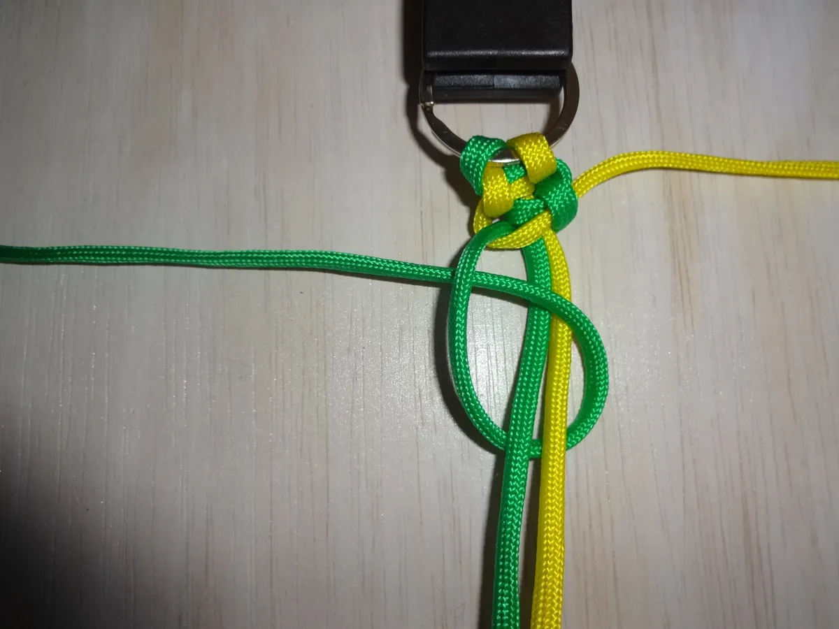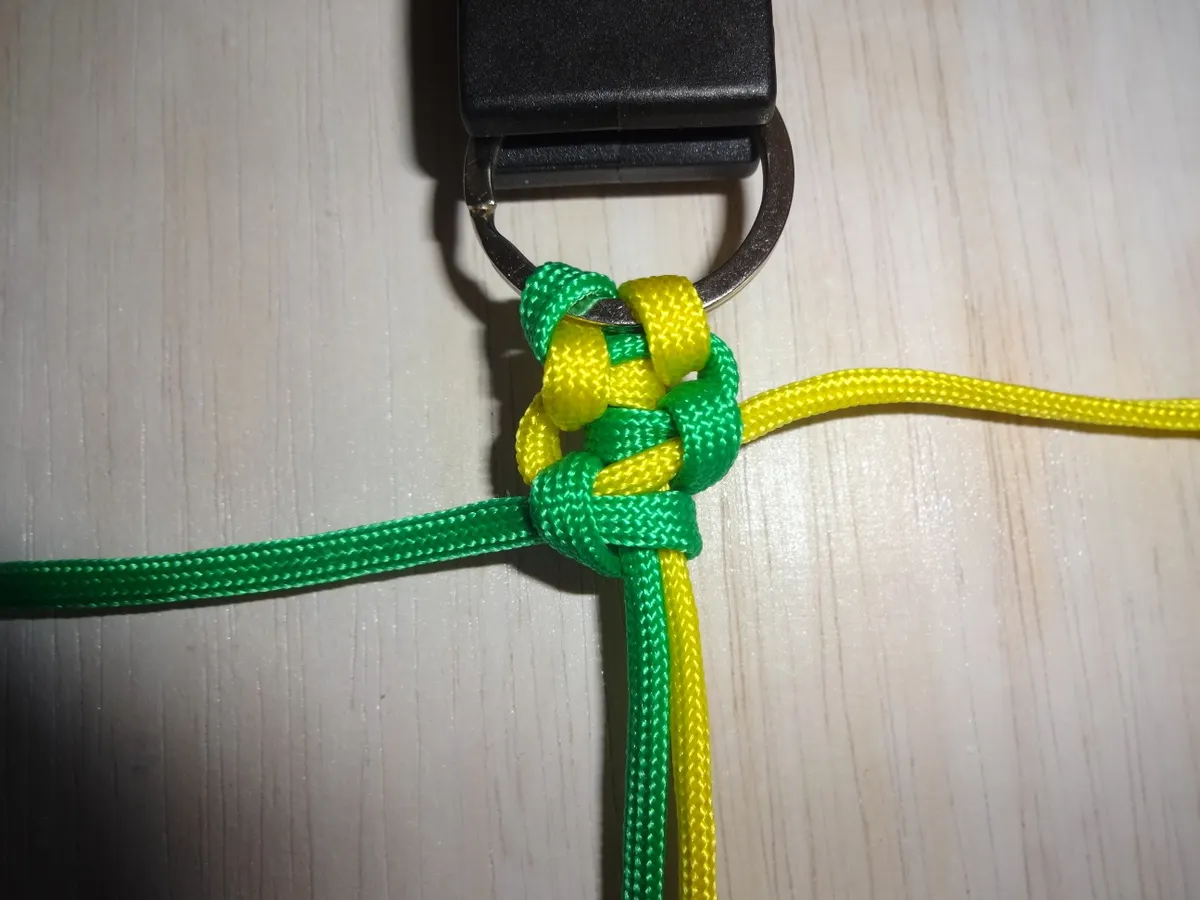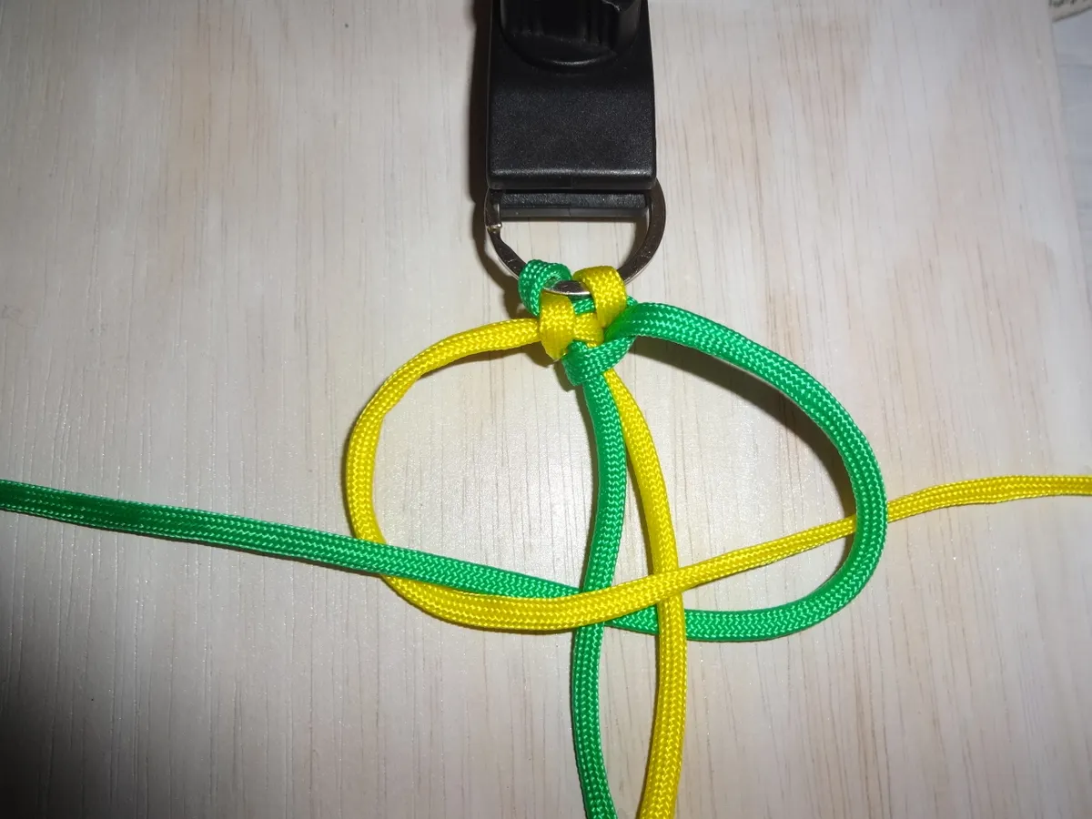 ↓ 黄を下側から図の様に 1巻き 通します。左側は緑に変わっても同じ 1巻き です。