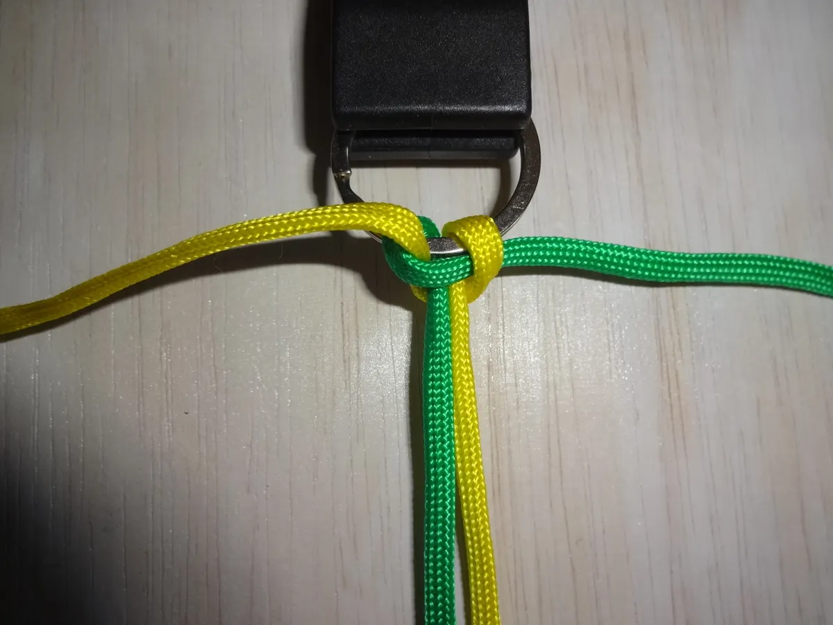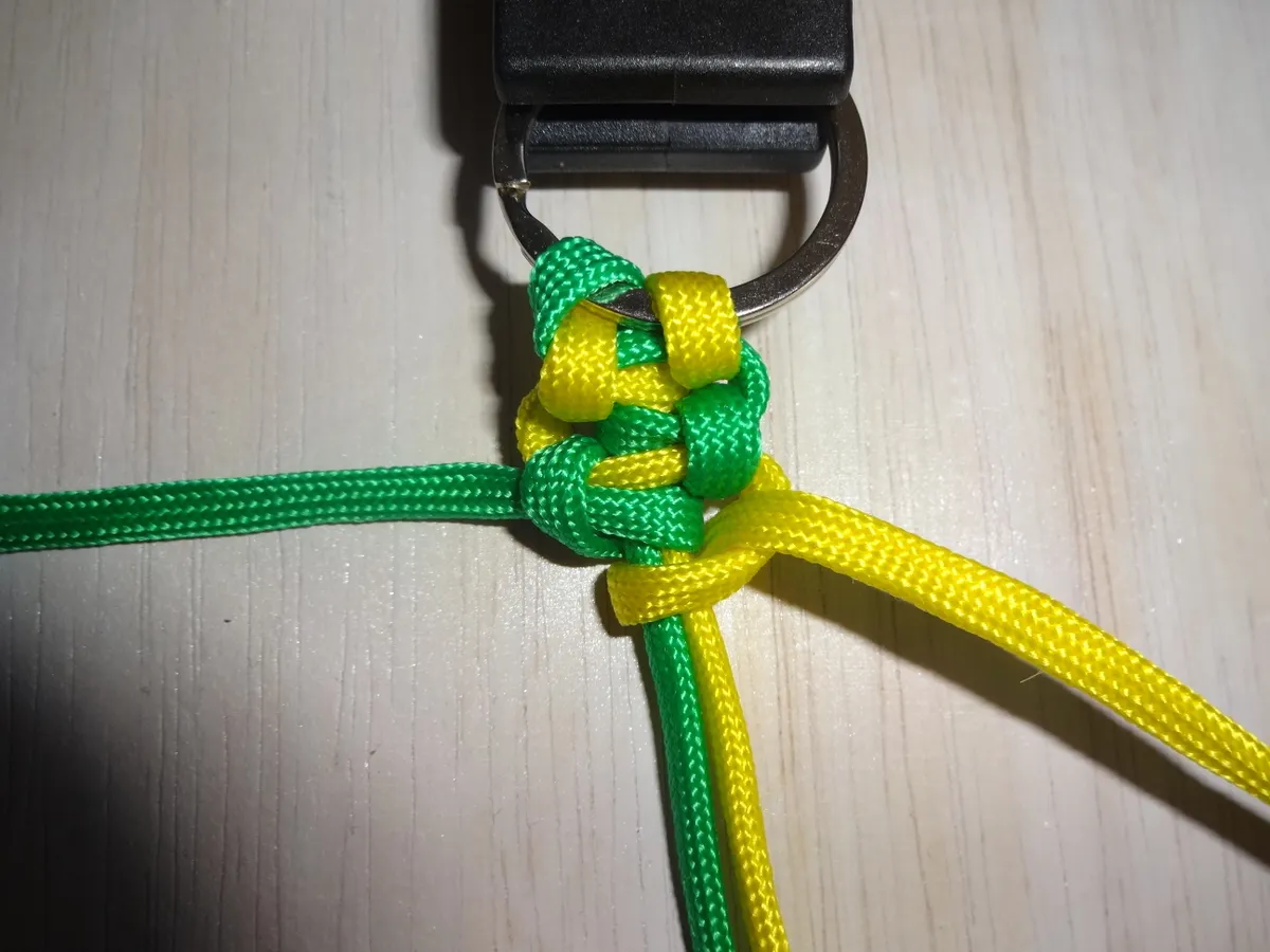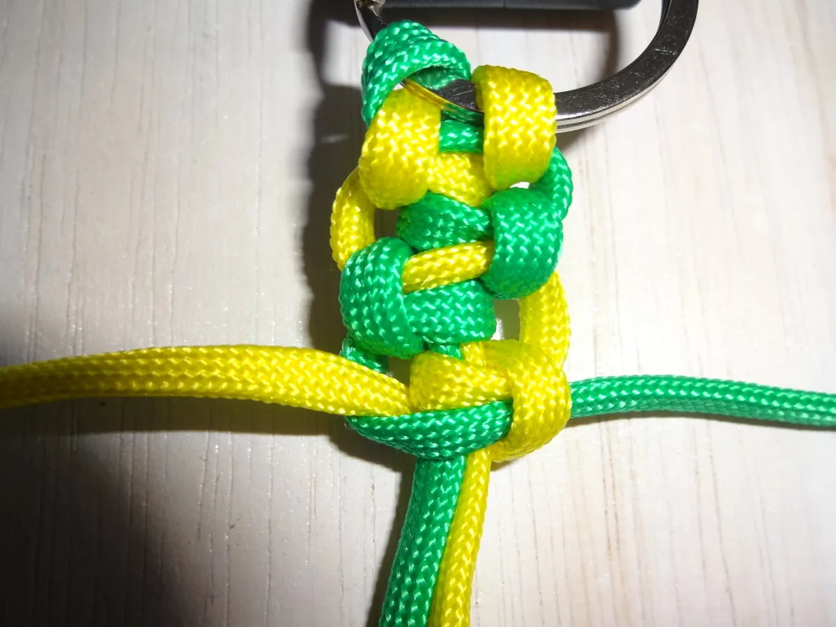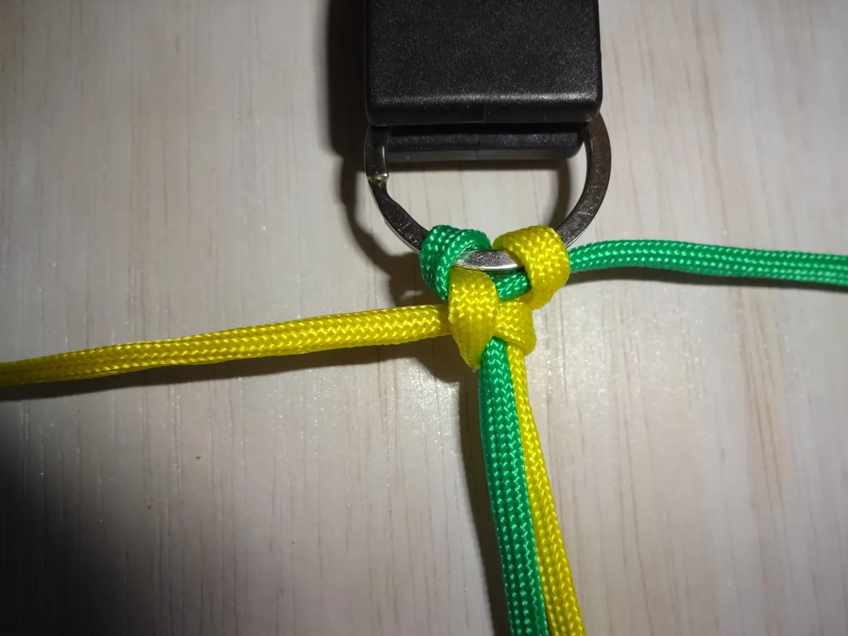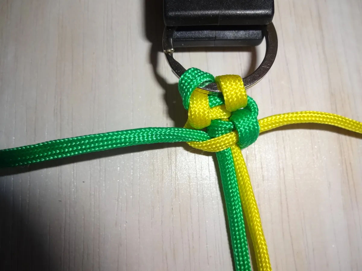 ↓ 黄を下側から図の様に 1巻き 通します。左側は緑に変わっても同じ 1巻き です。