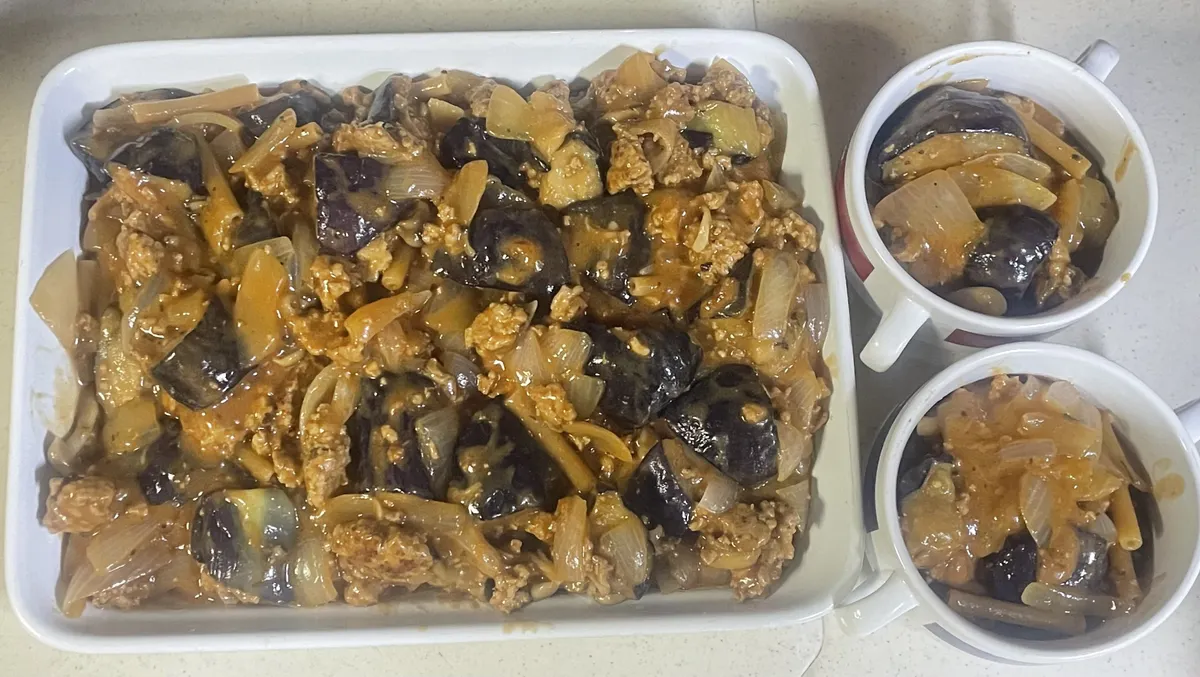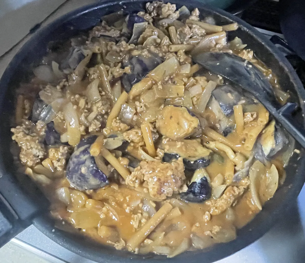 火を通す時間の2〜3分前に冷凍揚げ茄子投下して更に煮込むぅ〜🍆🧊➰🍳✨