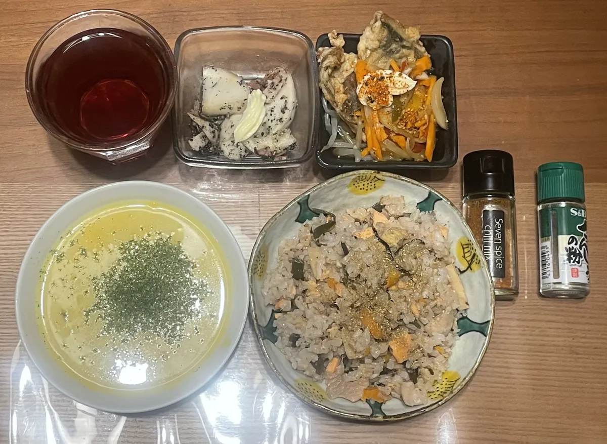 繋ぎもの適当サラダ&鯵の南蛮漬け&南瓜ポタージュ・鮭の炊き込みご飯✨