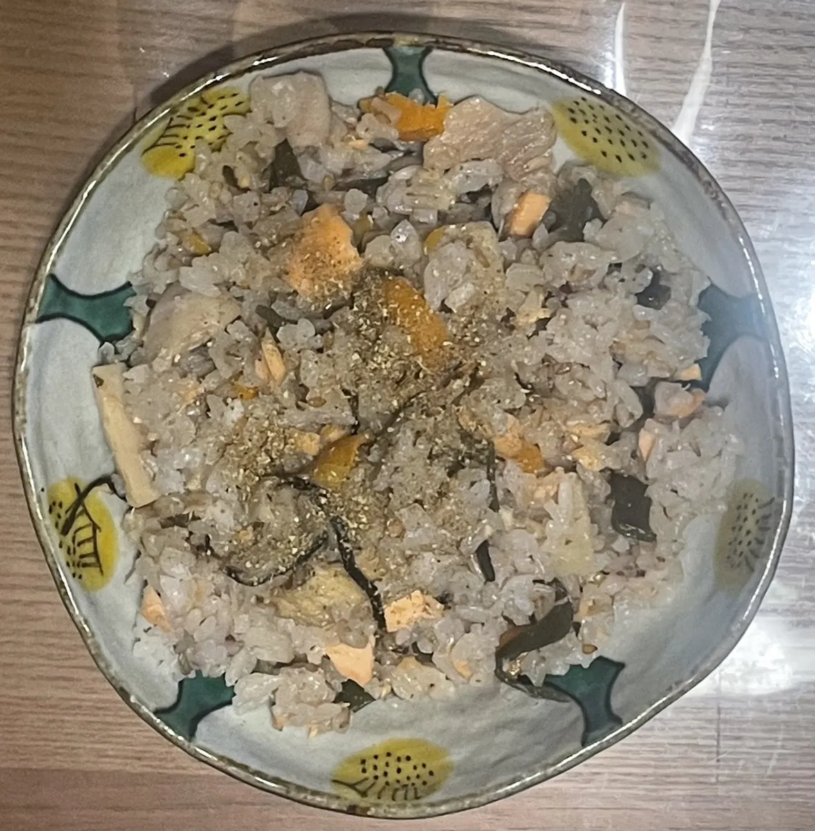 焼き目が付いたらあまり細かくならない程度に解しながら引っ繰り返して更に表裏が芳ばしくなる様に炒めたら、玉葱・味醂・ミル挽き黒胡椒を足してもうちょっとぉ〜🧅➰🍳🔥✨